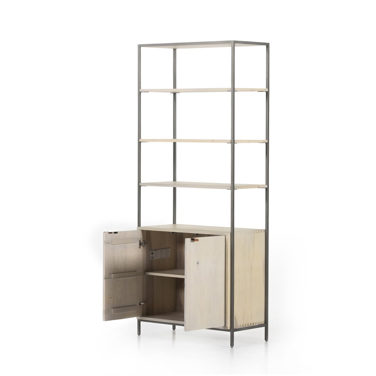 Inspired by clean midcentury design, solid poplar and raw iron fuse to offer storage and display space for favorite books and treasures. Metal-secured leather pulls add a textural element of surprise. Great alone or doubled and paired with matching media console