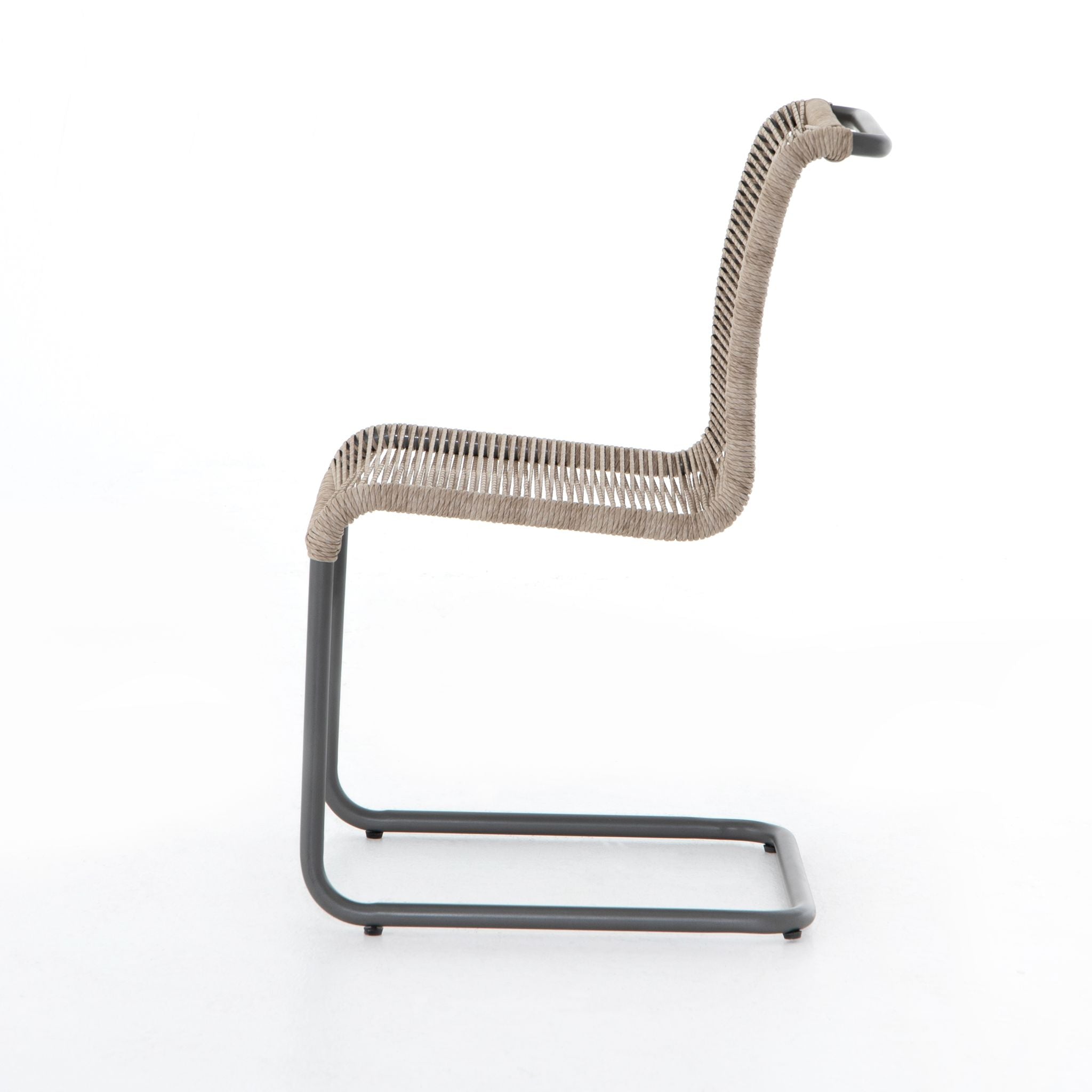 Attractive curvature summons a sit. A slim, gunmetal-finished iron frame supports woven all-weather wicker seating, for a textural twist on cantilever-style seating. Cover or store indoors during inclement weather and when not in use.