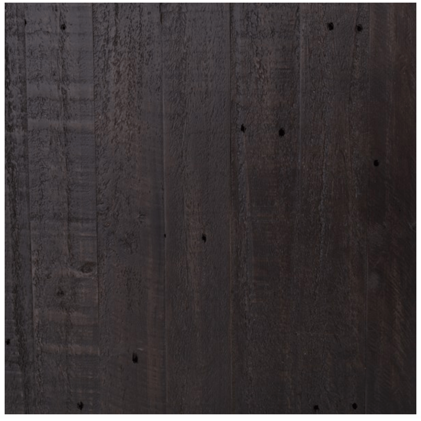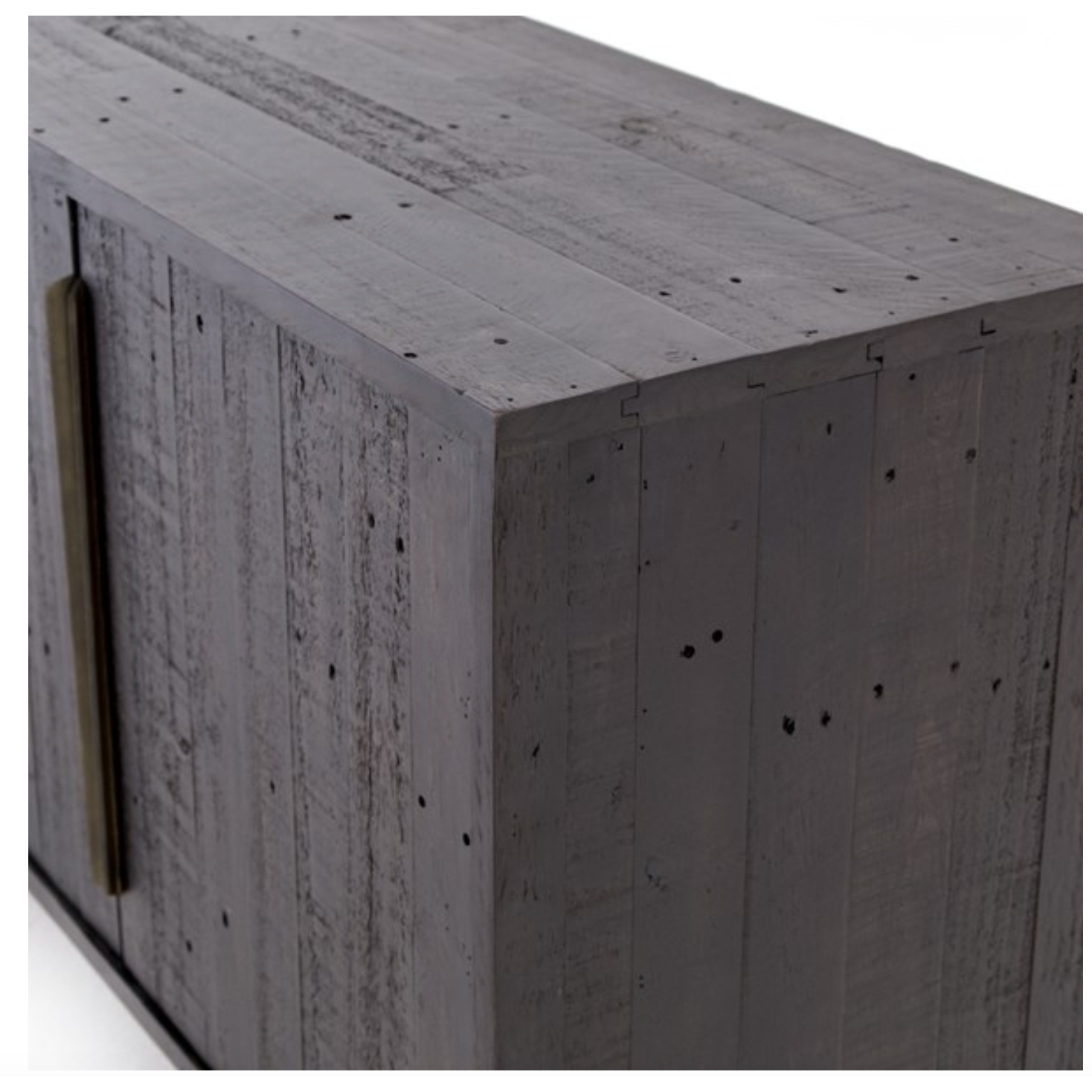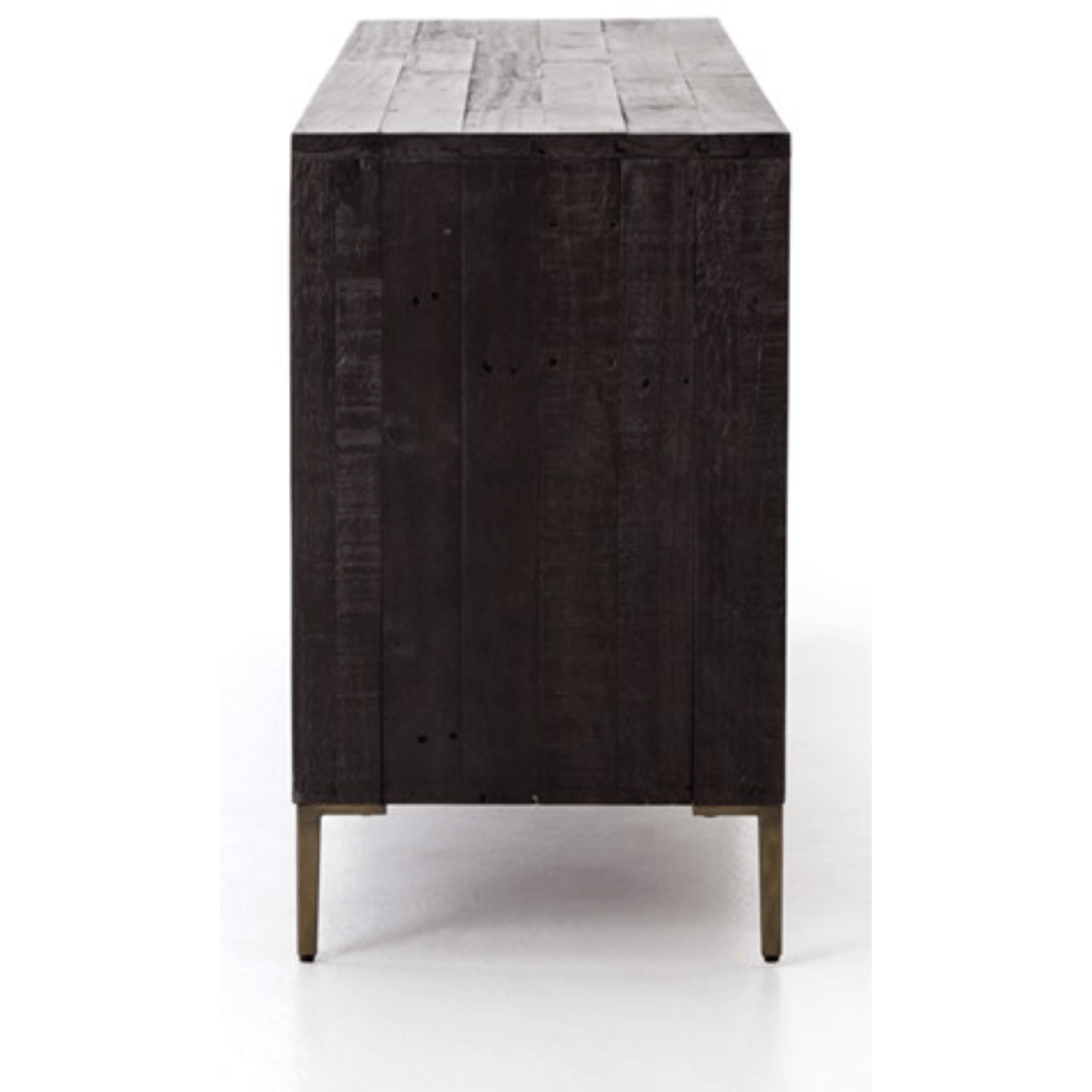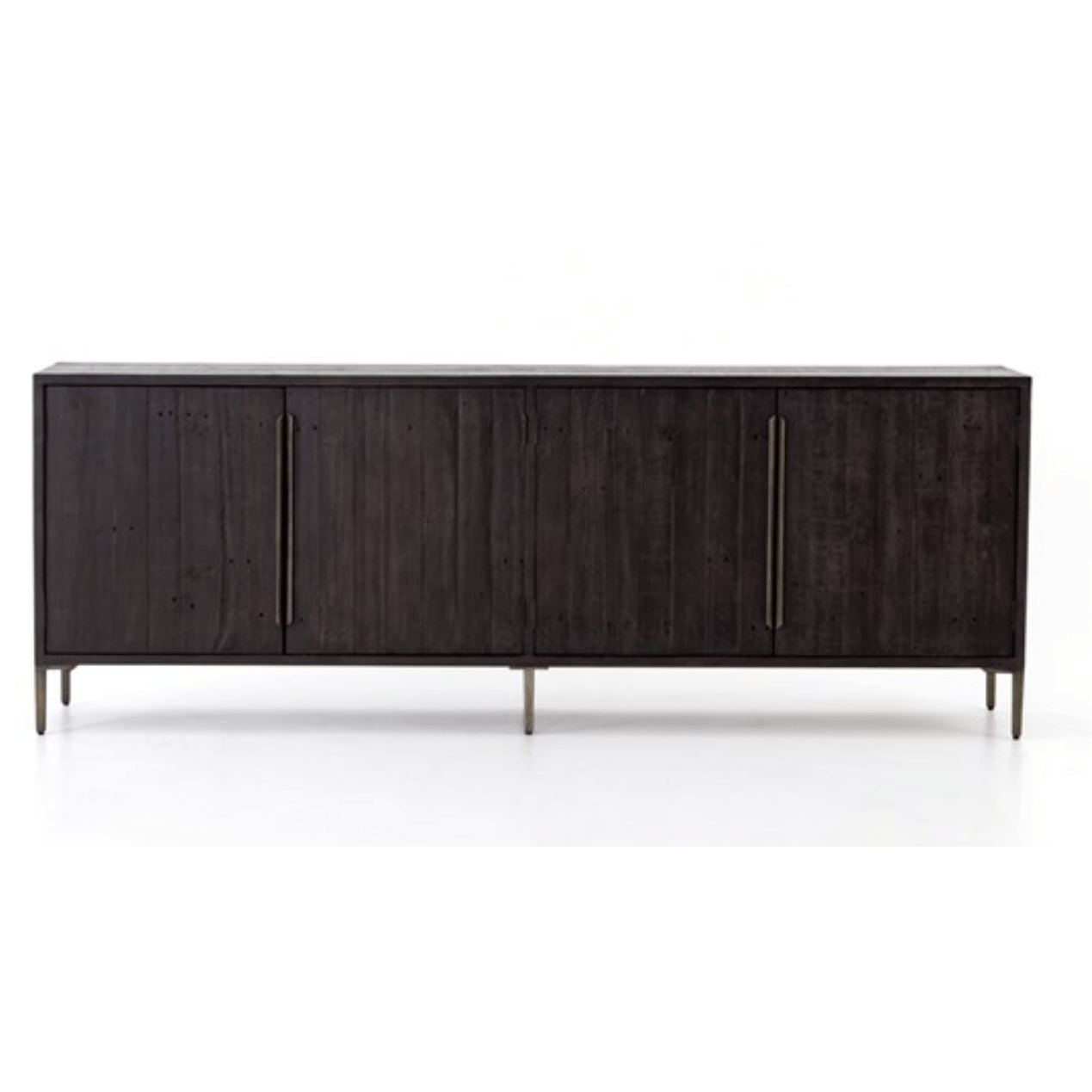 Reclaimed pine takes on a deep carbon tone, letting natural graining emit its innately rich character. Slim legs and flat, elongated antique brass-finished iron hardware place a fresh spin on a streamlined form. Four doors and interior shelving for ample dining or living room storage.