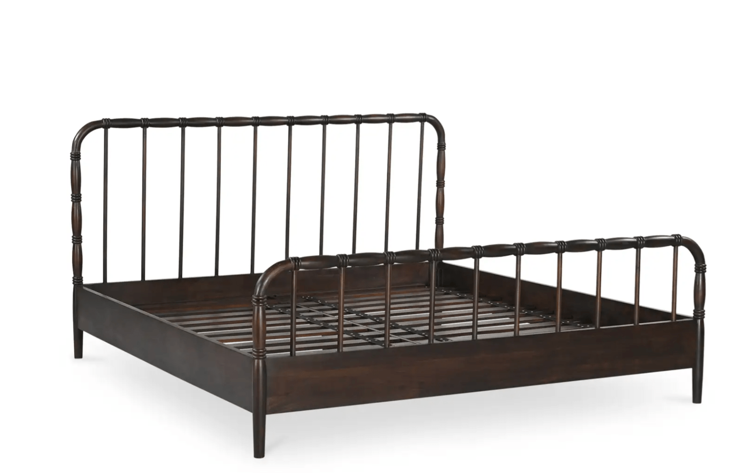 The Cassie bed embraces simplicity and pays close attention to detail. Its solid wood build and hand-turned embellishments bring a classic touch to each night, while also welcoming the modern day. Made of sturdy Acacia wood with framed turnings, this design boasts a semi-gloss dark brown finish. Supportive slats are provided to prevent mattress sinking or sliding, so no need for a box spring.