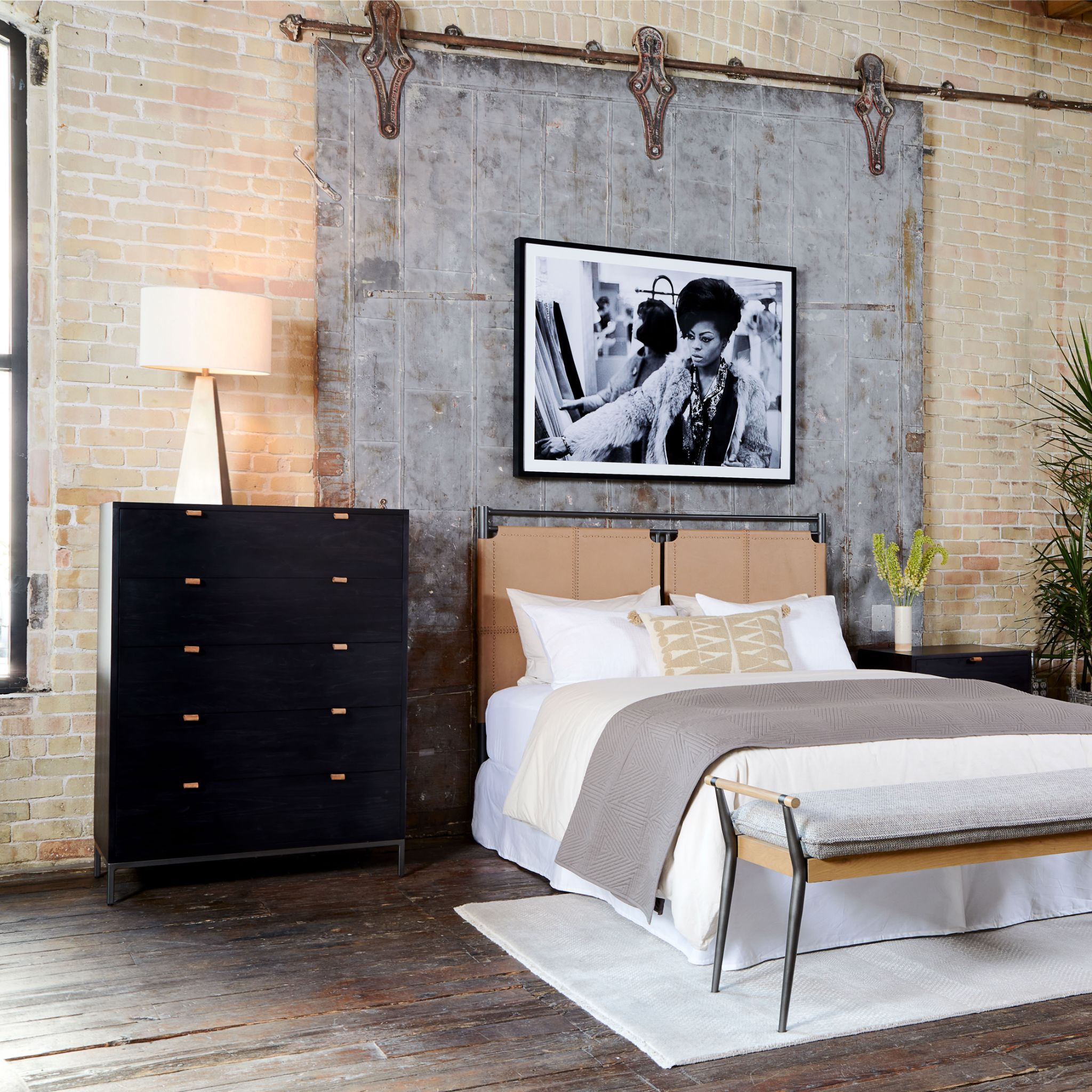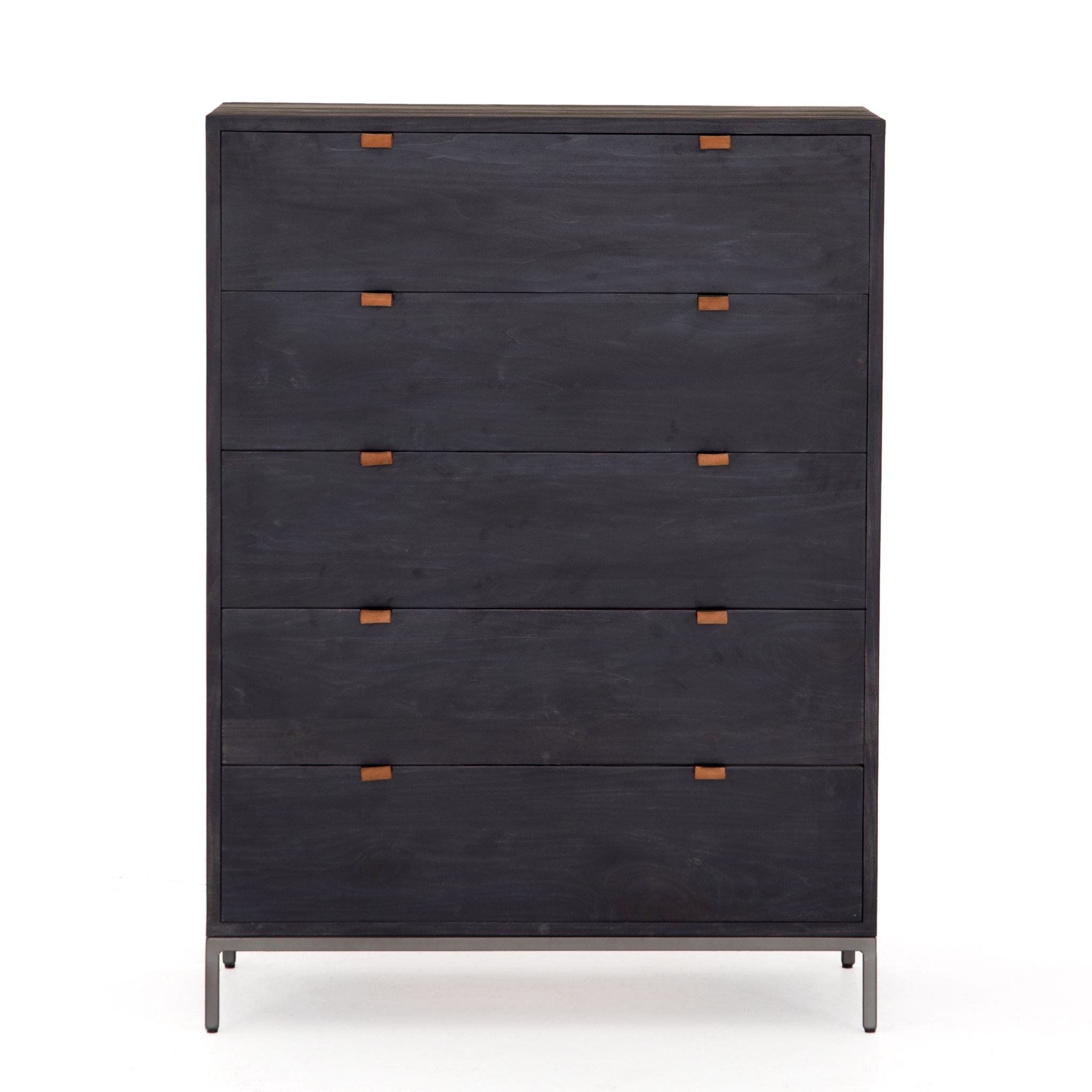 Inspired by clean mid-century design, a stylish dresser of black-washed poplar offers plenty of bedroom storage space thanks to five spacious drawers. Metal-secured leather pulls add a textural element of surprise.
