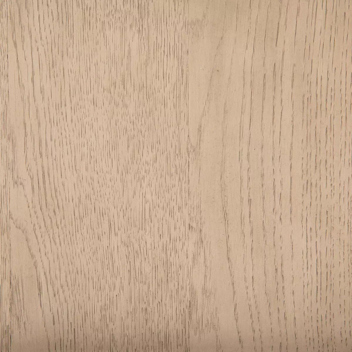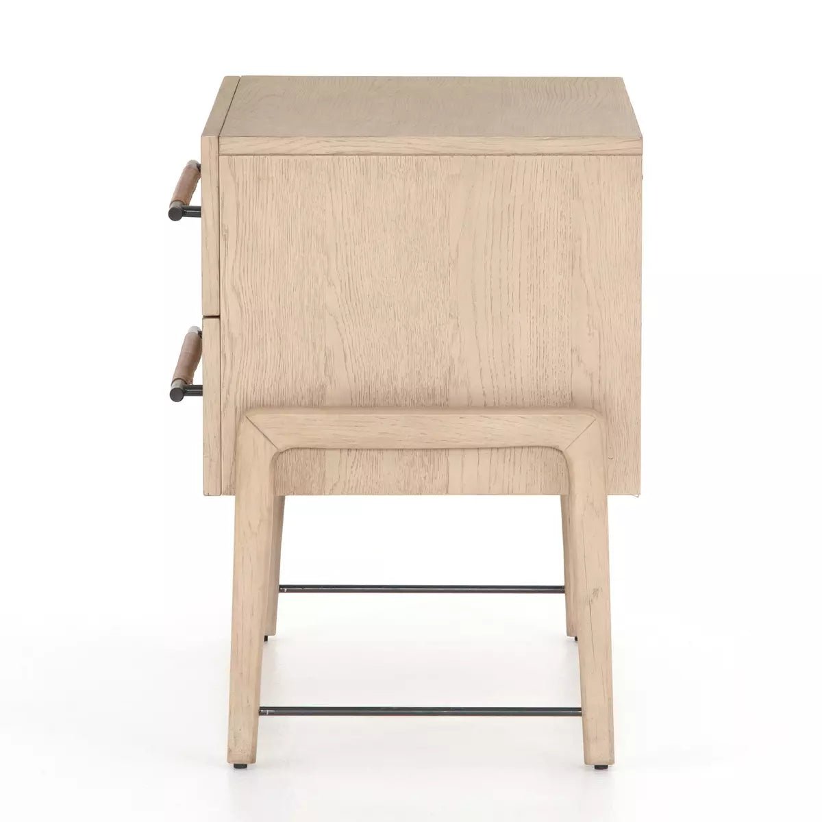 Light-finished oak forms a clean silhouette for dual drawers with iron hardware wrapped in tan top-grain leather.