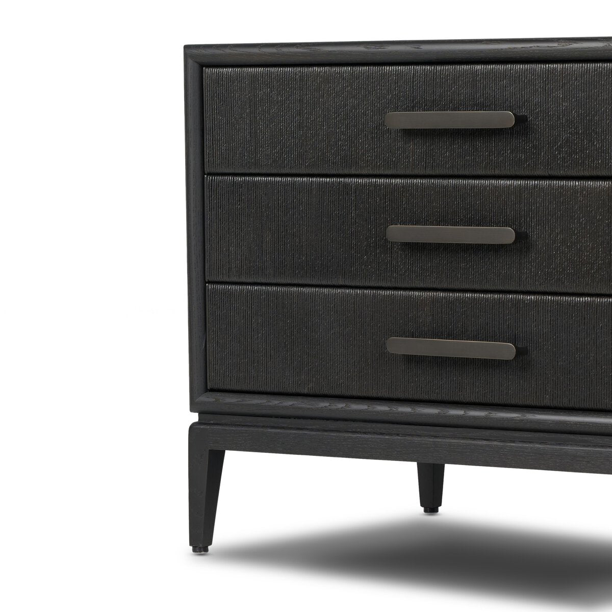 Elevate your bedside storage with a nightstand of black-finished oak. A smooth top pairs with three drawer fronts of woven paper cord for a dark, rich look that will work into your bedroom collection beautifully.