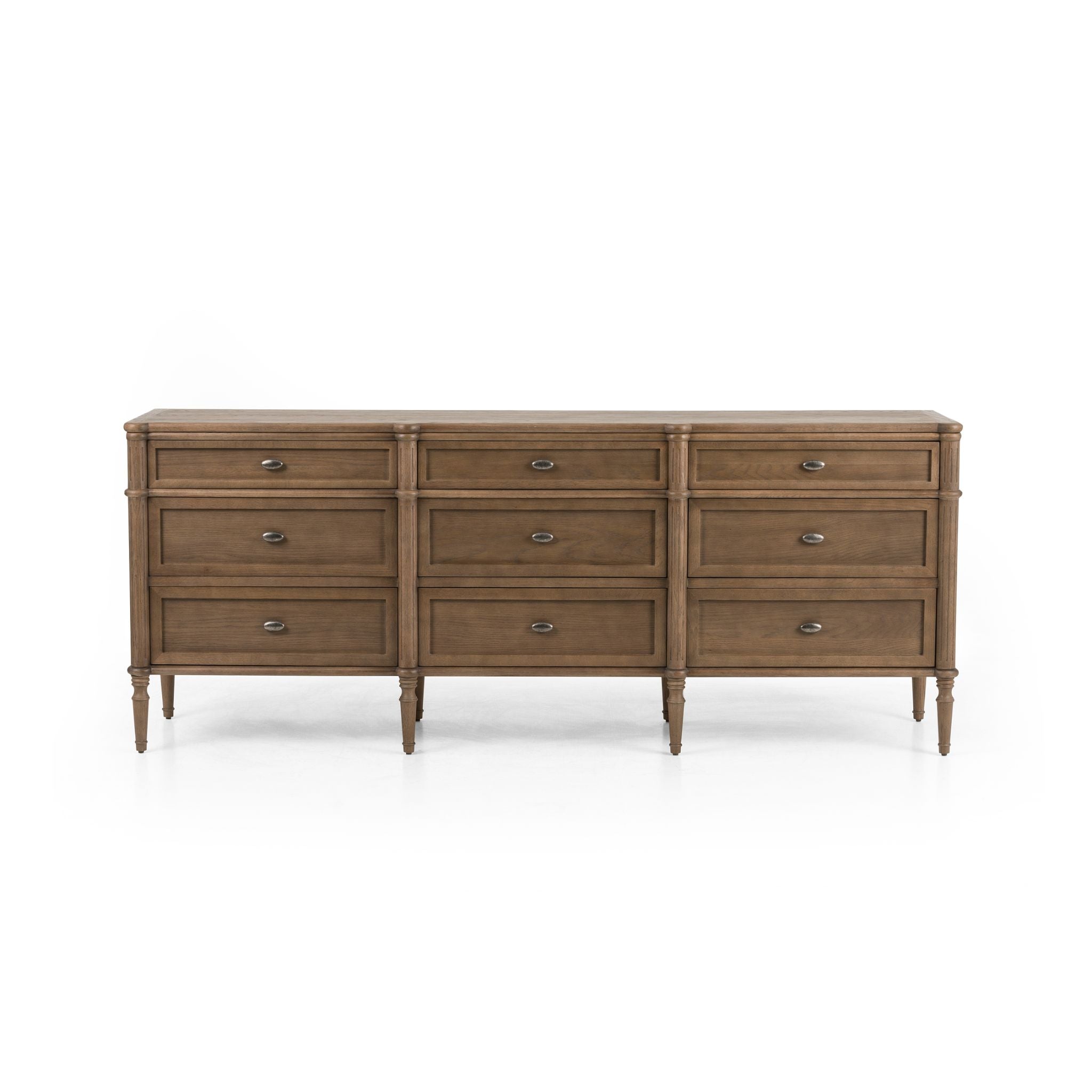 Made from toasted oak veneer with slim, solid oak legs, a vary-sized drawers bring antique European vibes to modern bedroom styling.