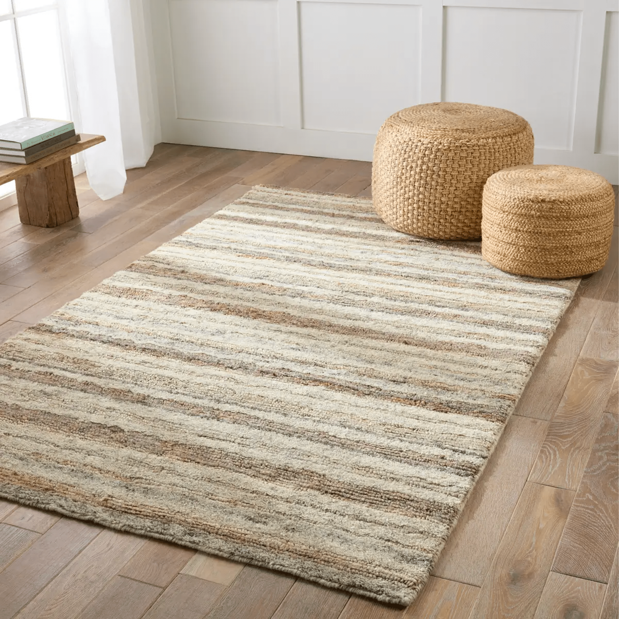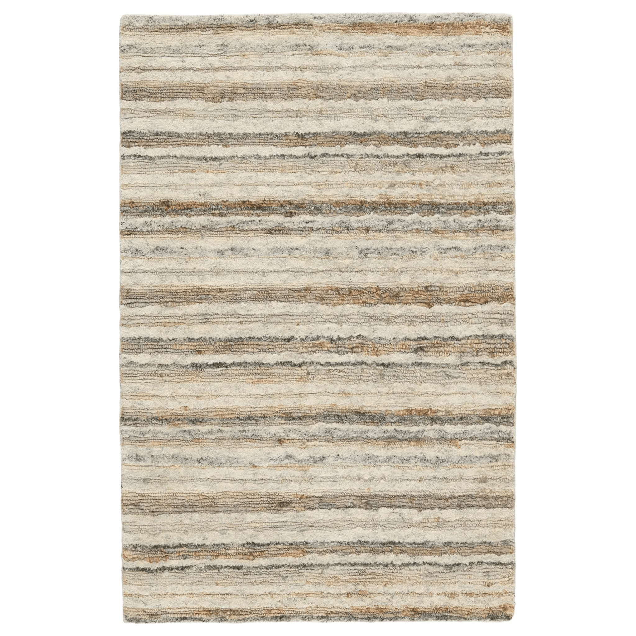 Handwoven of jute and wool, the Hatha collection showcases a soft and textural cut-and-loop pile with stunning neutral color striations. The Tikka area rug features a timeless stripe pattern in tones of brown, gray, and cream. The natural beauty of this inviting design provides a grounding accent to medium and low traffic areas such as formal living spaces and bedrooms.