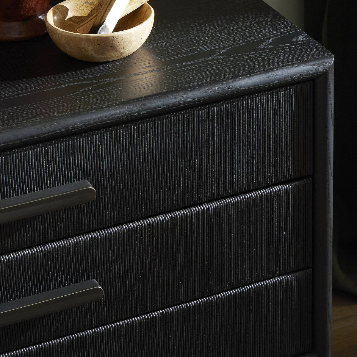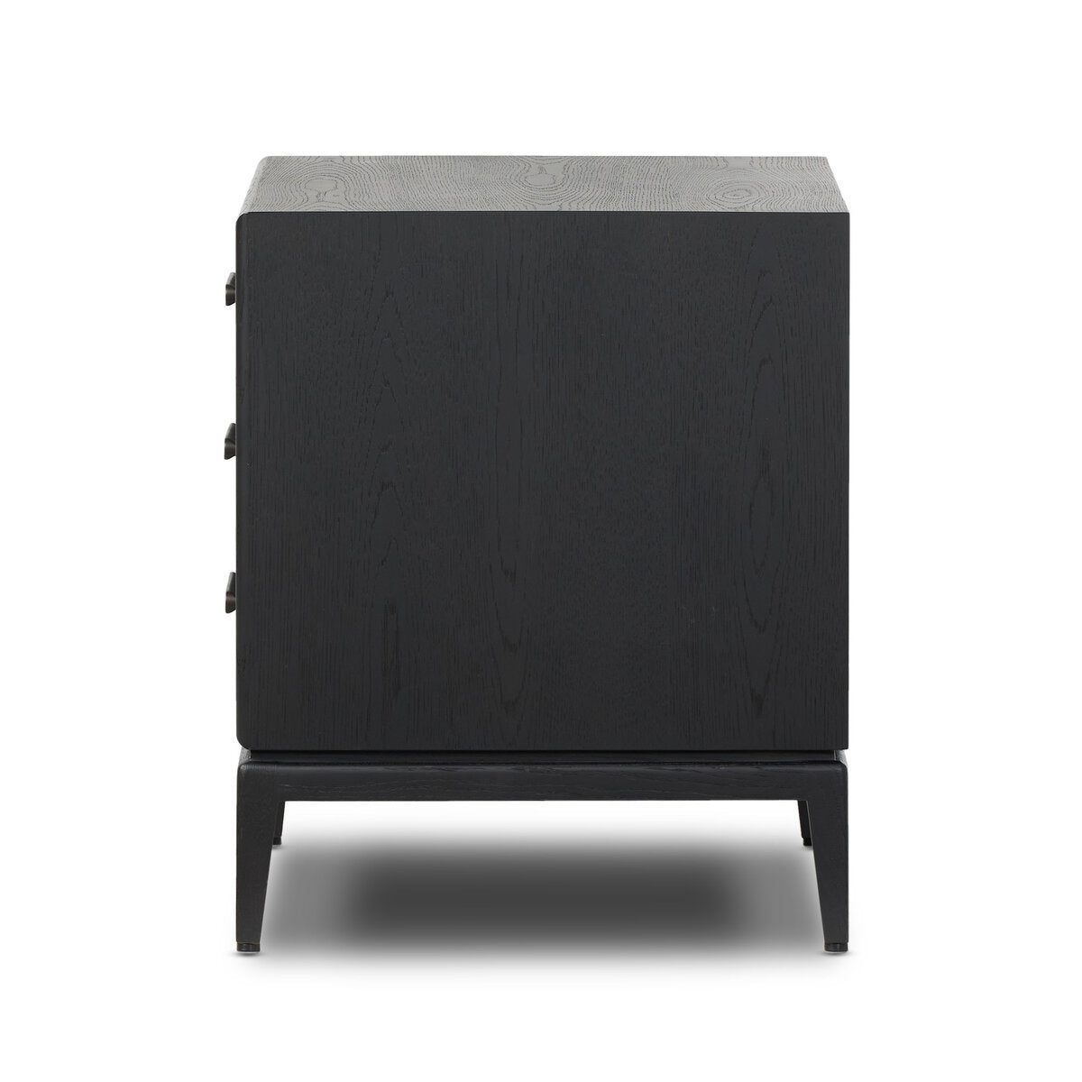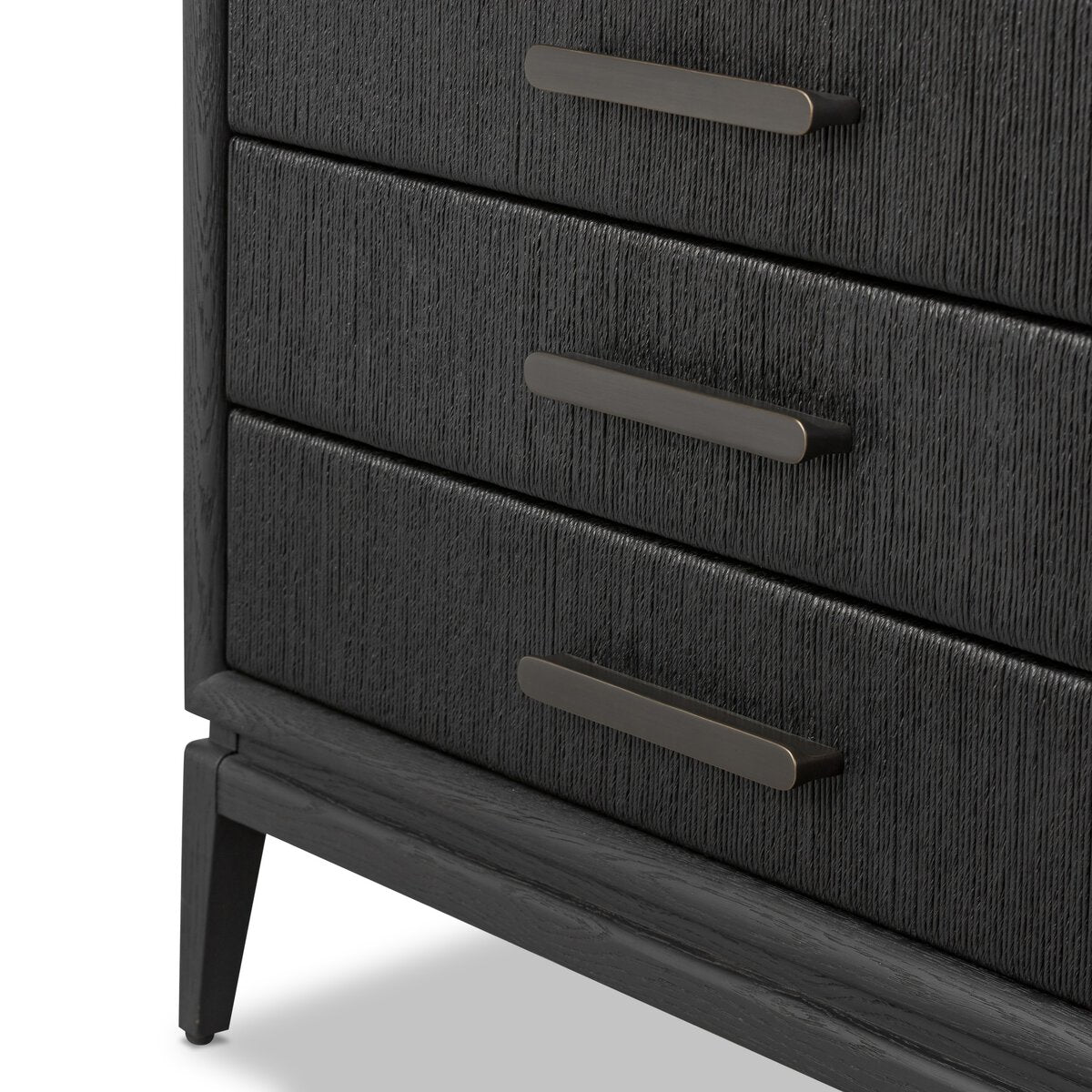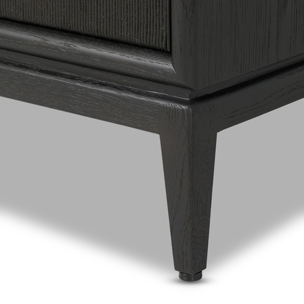 Elevate your bedside storage with a nightstand of black-finished oak. A smooth top pairs with three drawer fronts of woven paper cord for a dark, rich look that will work into your bedroom collection beautifully.