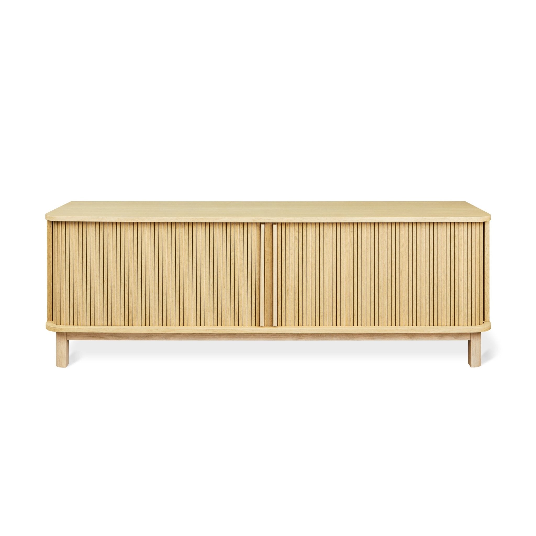 A modern masterpiece in form and function, the Ledger Credenza is designed to make a refined statement in your living room, office, or dining space. Featuring elegant tambour-style sliding doors, this piece allows you to reveal or conceal storage with ease. The doors glide smoothly into the back of the cabinet, creating a clean, hardware-free aesthetic and maximizing space efficiency.