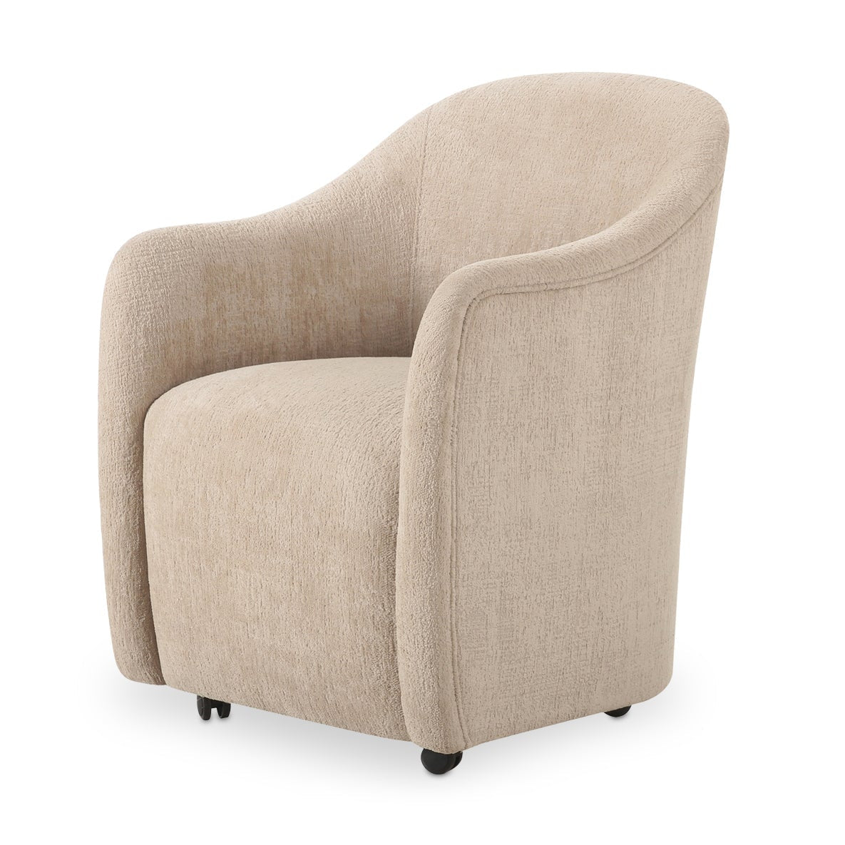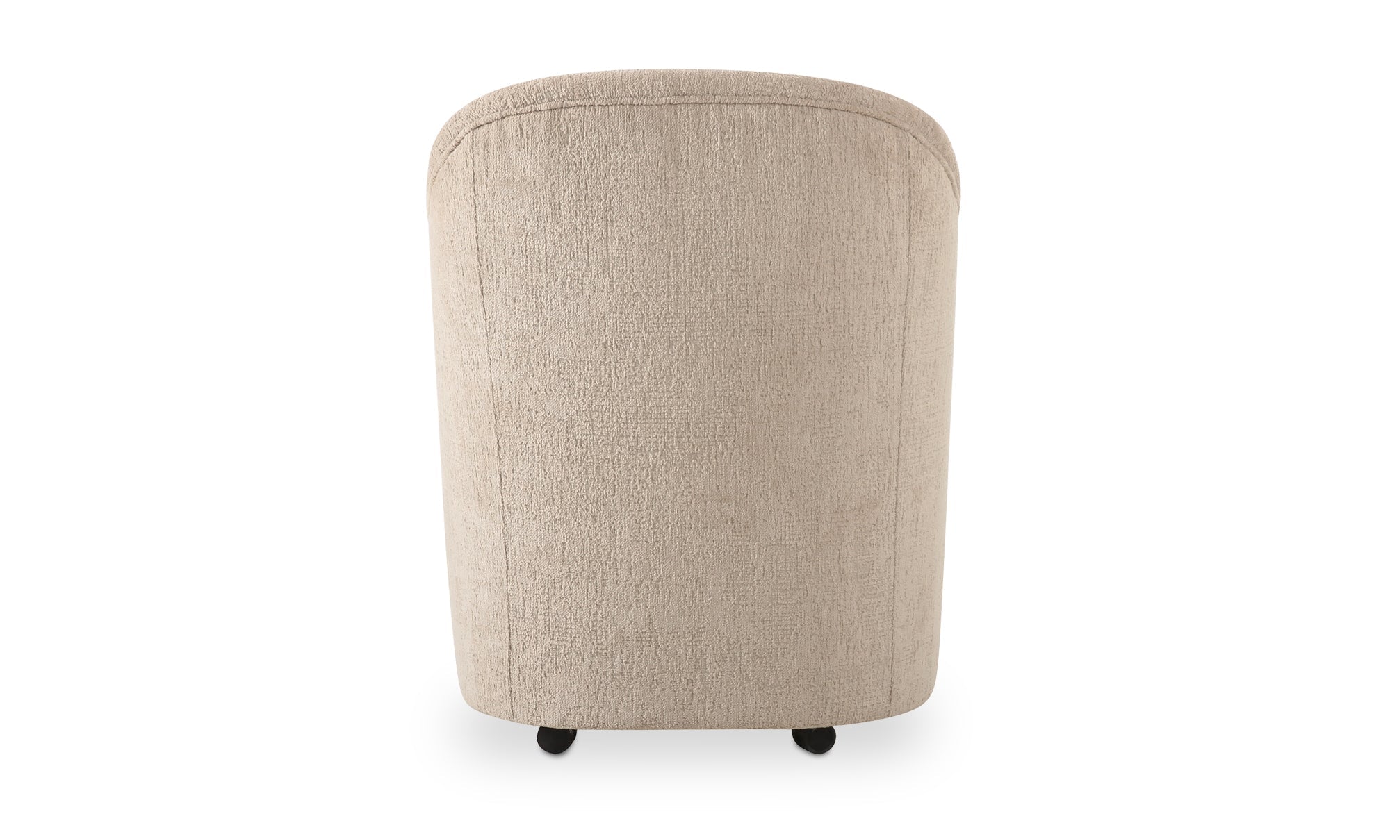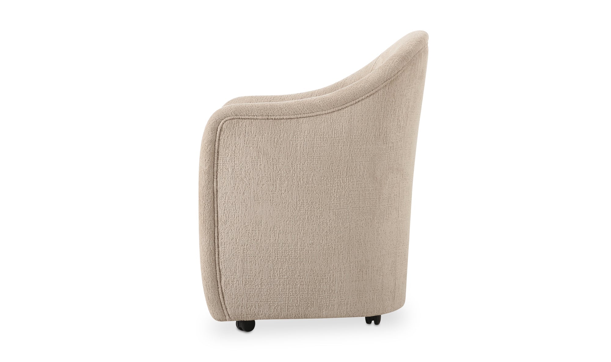 Pull up, roll in, stay awhile. Drava gives the classic barrel chair a fresh assignment: dinner, desk, or wherever the conversation lands. A continuous curve sweeps from arm to back, cradling you while the squared, padded seat keeps things grounded. Soft, textured beige polyester upholstery meets a plywood frame with foam-and-fiber cushioning for all-night comfort. Bonus: the rolling base swaps to included plastic legs when you want it to stand still, and looks good, too.