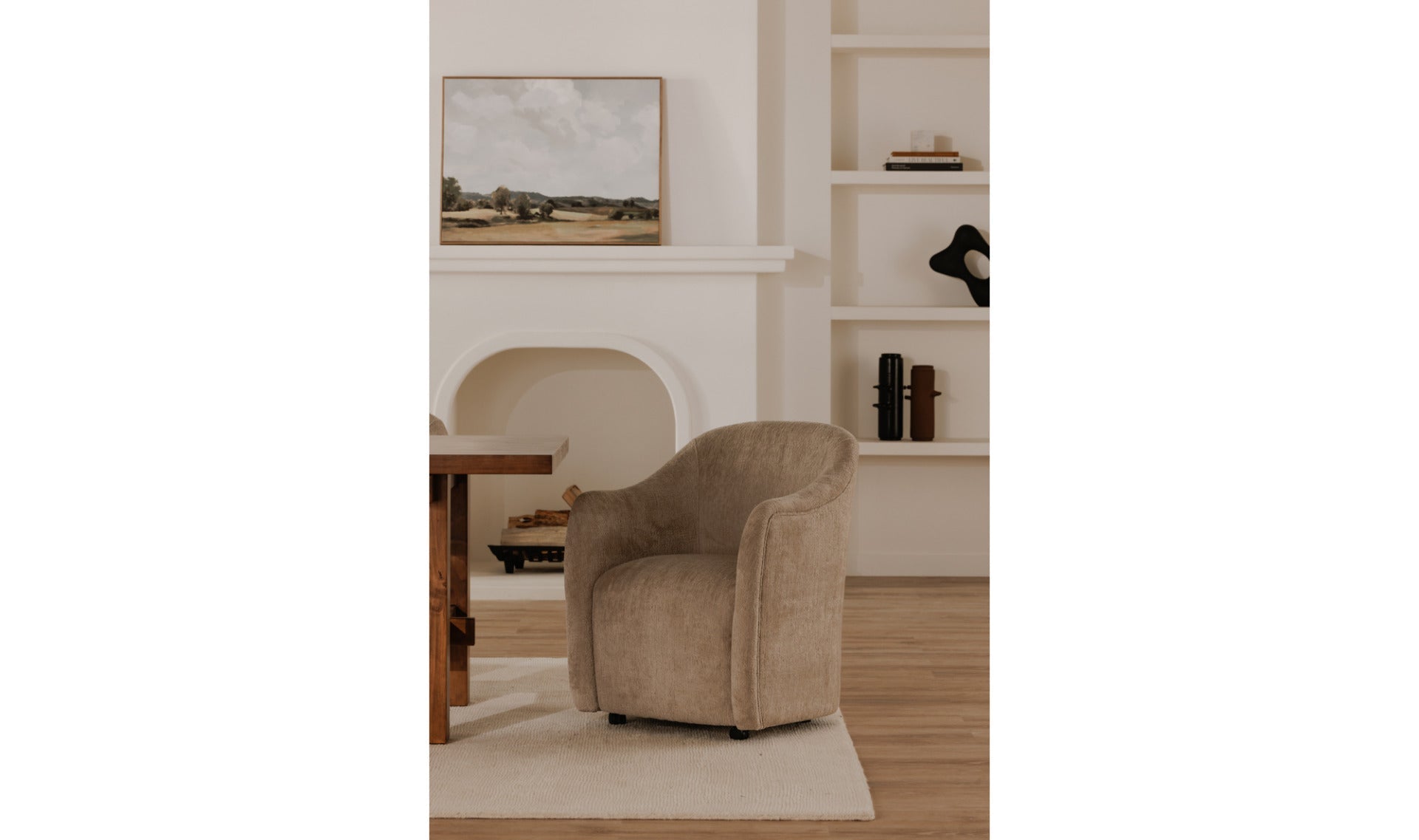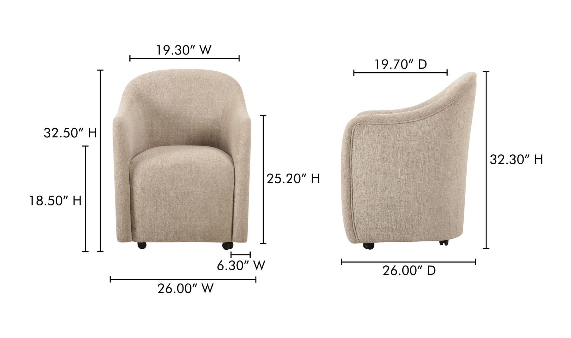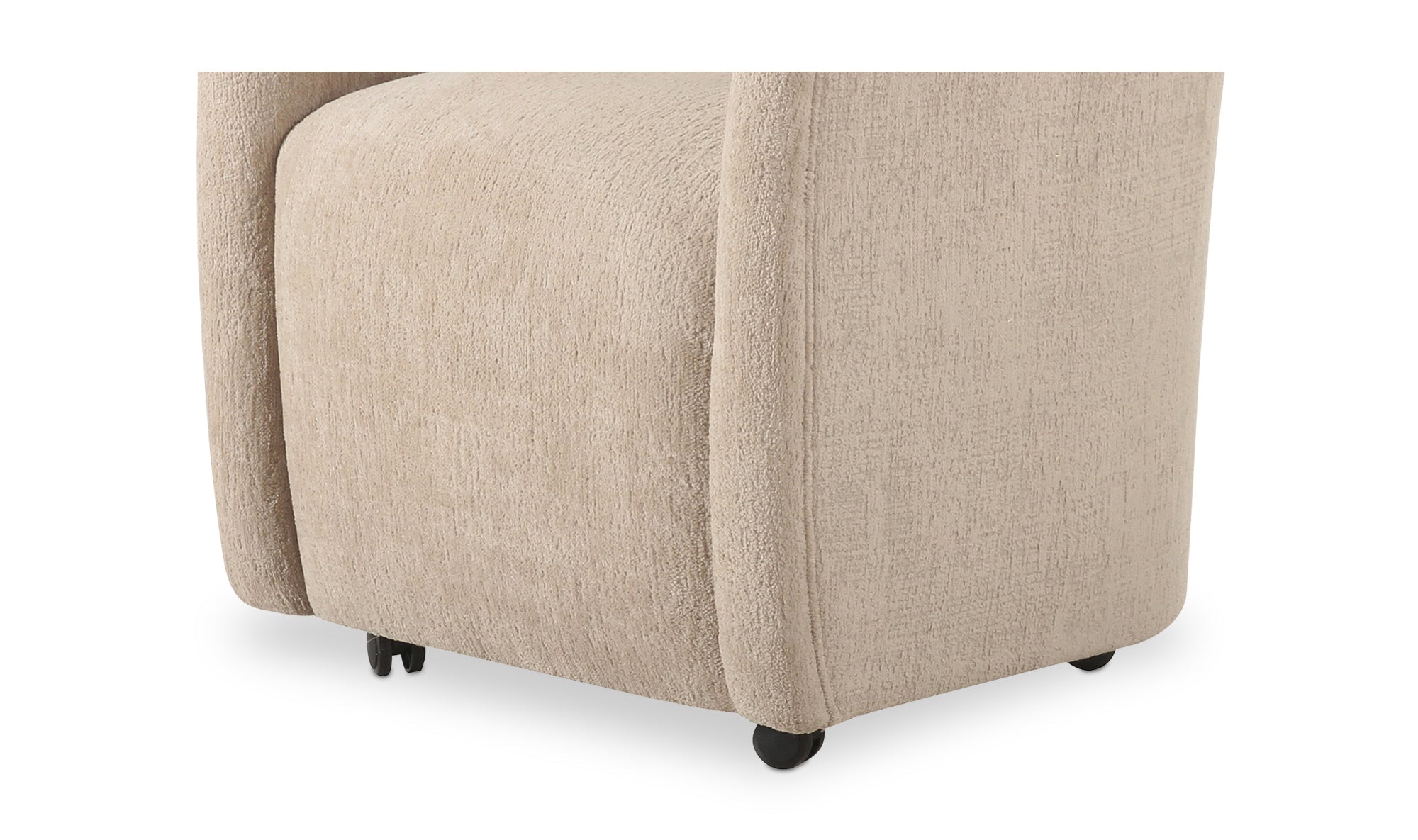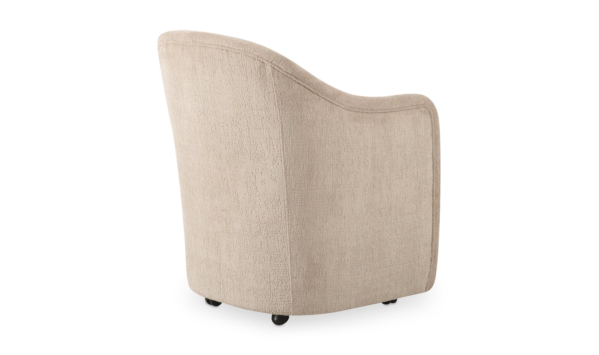 Pull up, roll in, stay awhile. Drava gives the classic barrel chair a fresh assignment: dinner, desk, or wherever the conversation lands. A continuous curve sweeps from arm to back, cradling you while the squared, padded seat keeps things grounded. Soft, textured beige polyester upholstery meets a plywood frame with foam-and-fiber cushioning for all-night comfort. Bonus: the rolling base swaps to included plastic legs when you want it to stand still, and looks good, too.