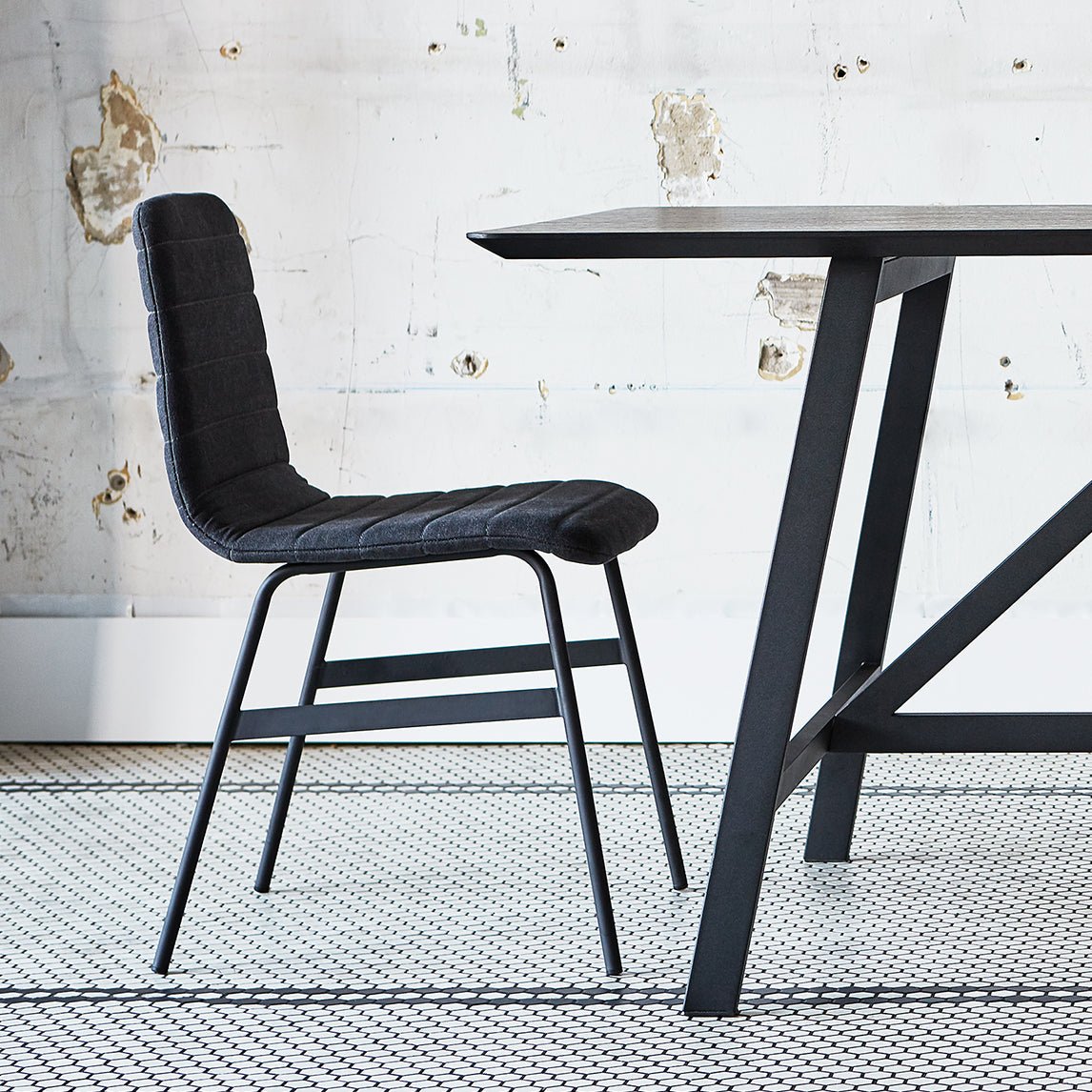 The Lecture Dining Chair blends nostalgic charm with modern sophistication. Inspired by classic schoolhouse silhouettes, this refined reinterpretation features a one-piece upholstered seat and back with elegant channel-stitch detailing. Crafted for comfort and sustainability, select upholstery options are made from 100% recycled plastic bottles—diverted from landfills and waterways, then transformed into soft, durable fabric. A leather and brass handle adds a functional, tactile accent, while black powder-coated steel legs with solid metal stabilizers ensure lasting support. Perfect for dining spaces or creative work environments, the Lecture Chair offers timeless style with a contemporary edge.