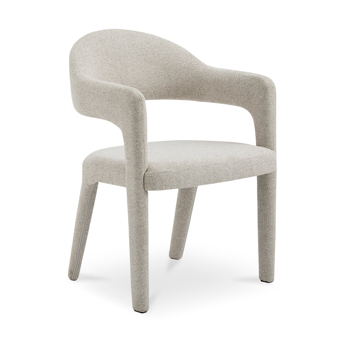 The Martens dining chair features an open barrel back and a continuous curve from leg to frame. Its iron frame is complemented by generously padded seating, marrying comfort with a clean, uncluttered design. Armrests introduce a note of formality, while the airy back lends a touch of lightness and sophistication.