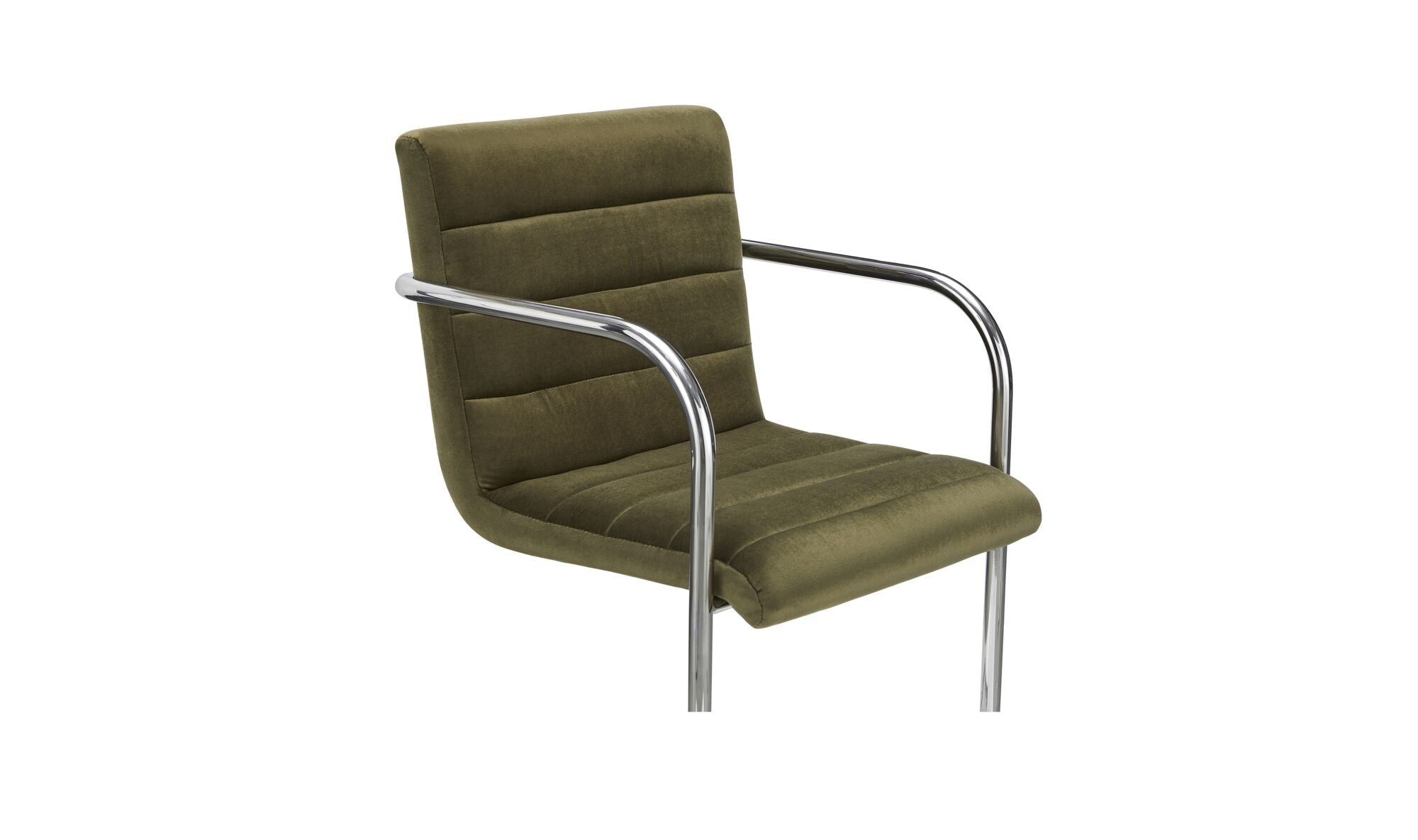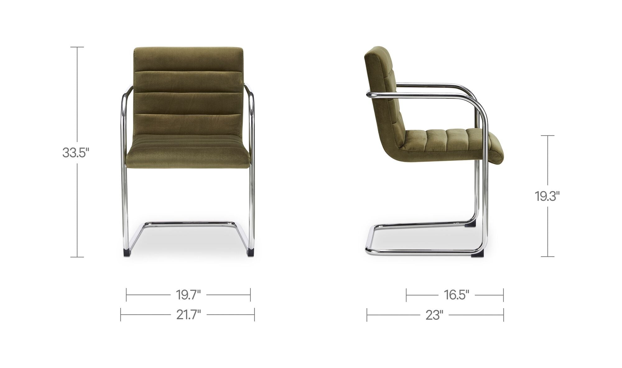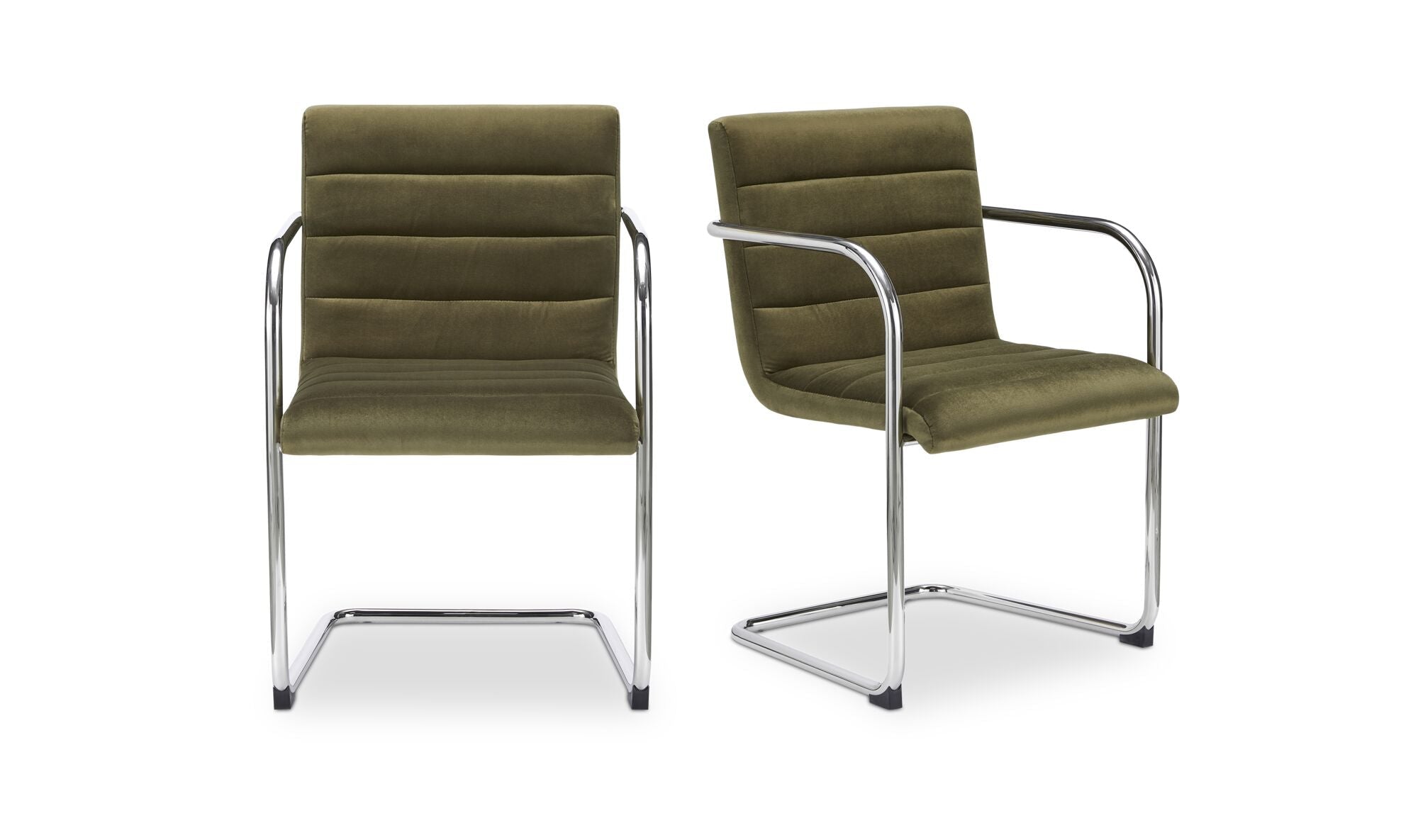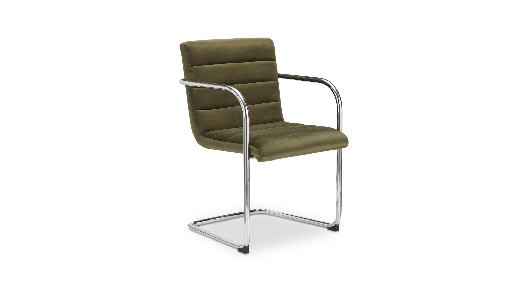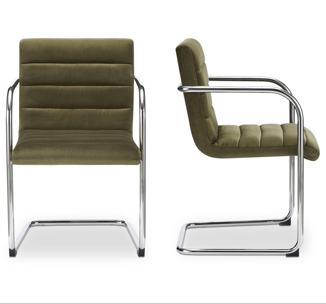 Sleek cantilever stainless steel frames create an illusion of weightlessness, contrasting beautifully with sumptuous, channeled upholstery in the Pedro dining chair. Upholstered in faux green mohair, the generous seat and back cocoon in comfort.
