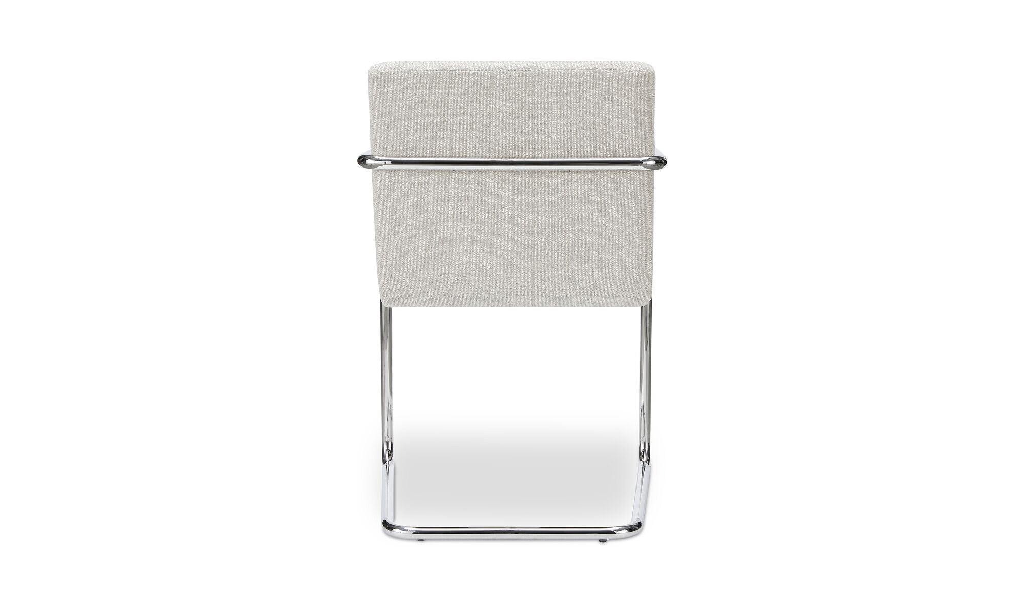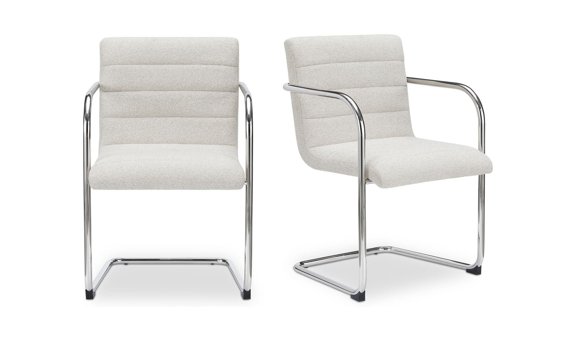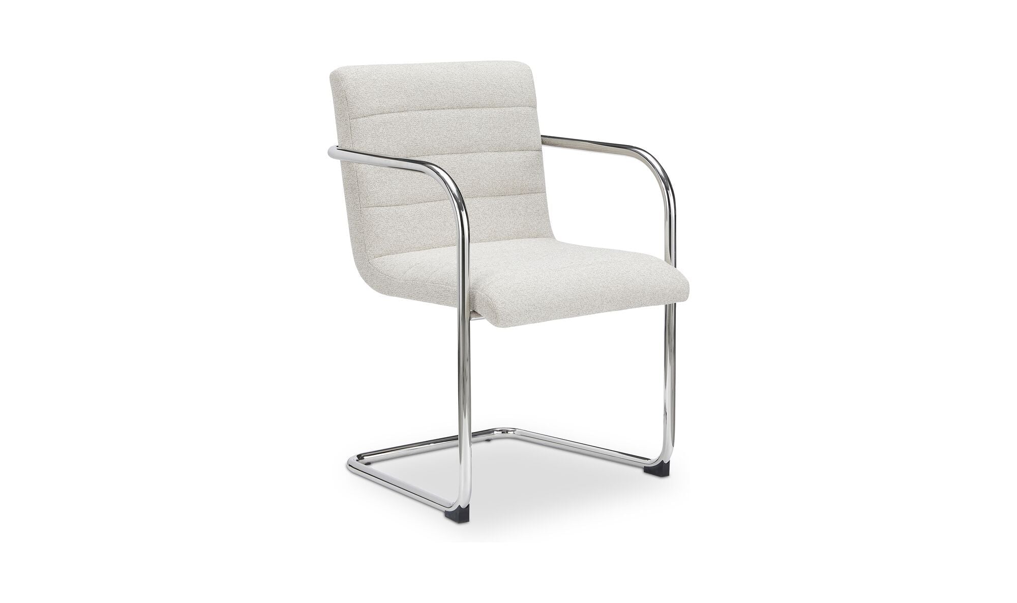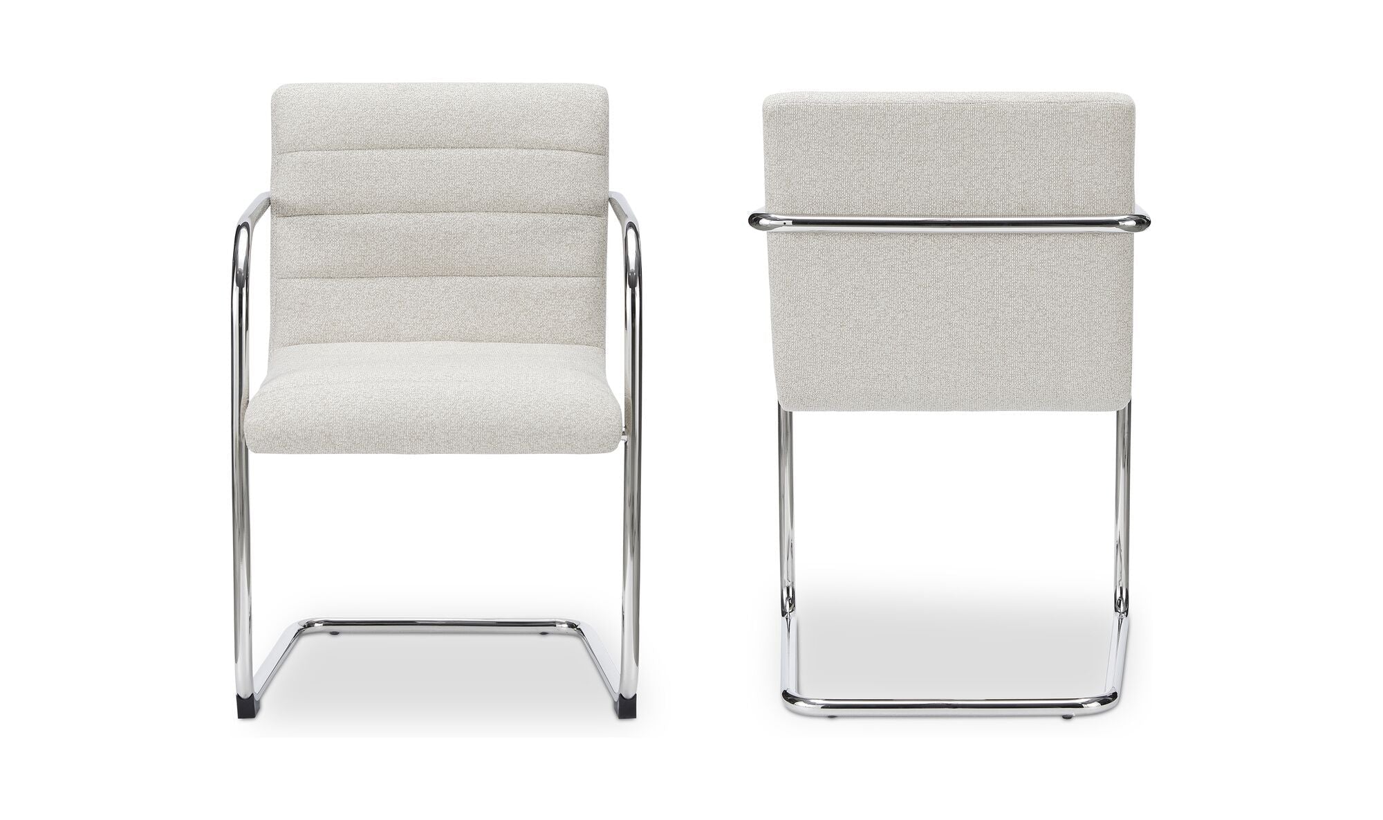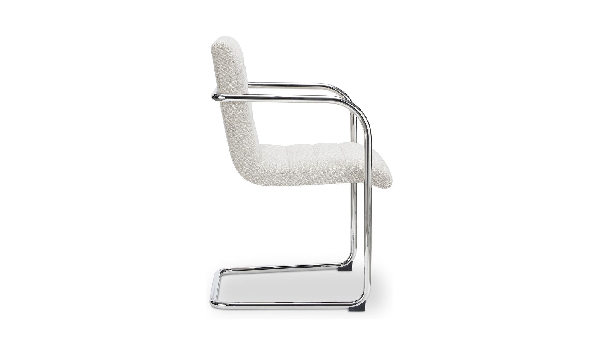 Sleek cantilever stainless steel frames create an illusion of weightlessness, contrasting beautifully with sumptuous, channeled upholstery in the Pedro dining chair. Upholstered in faux green mohair, the generous seat and back cocoon in comfort.