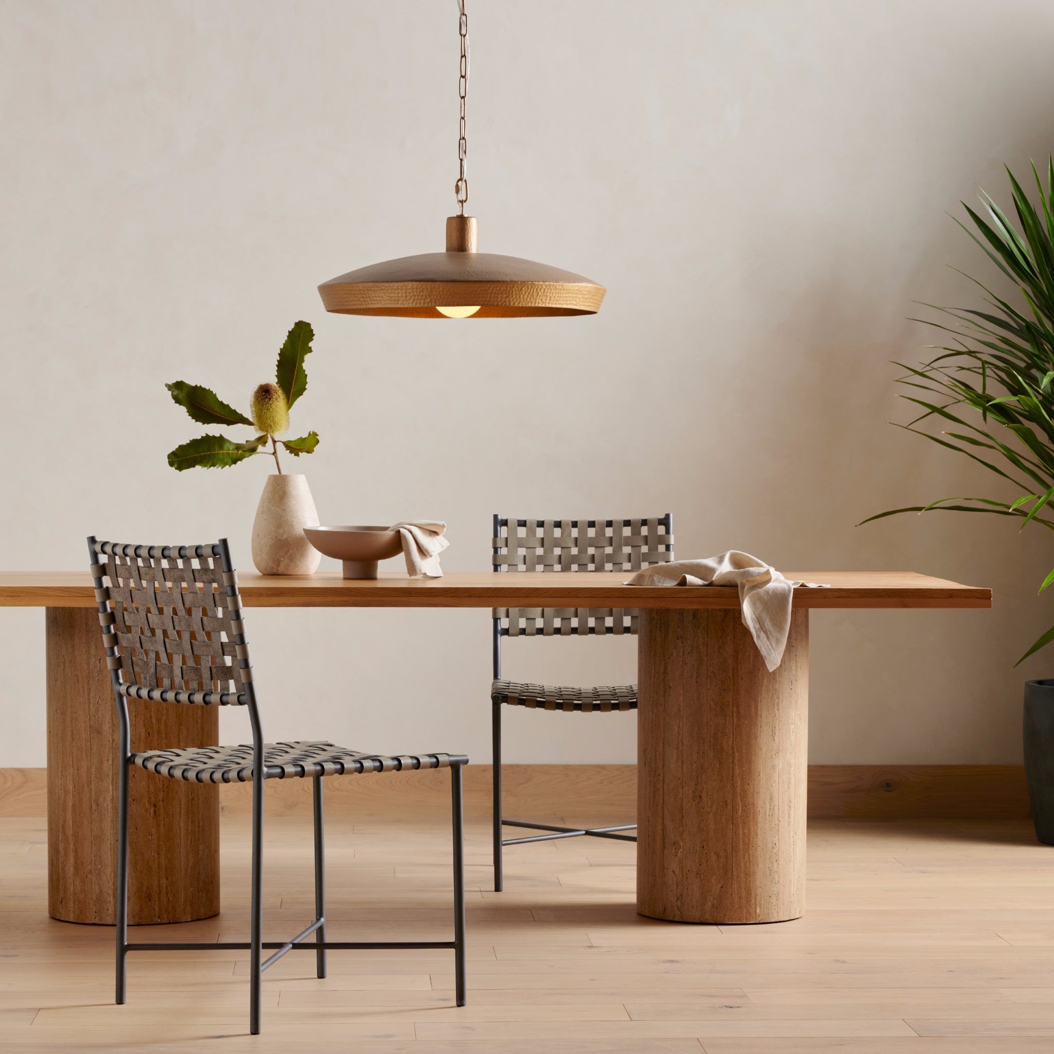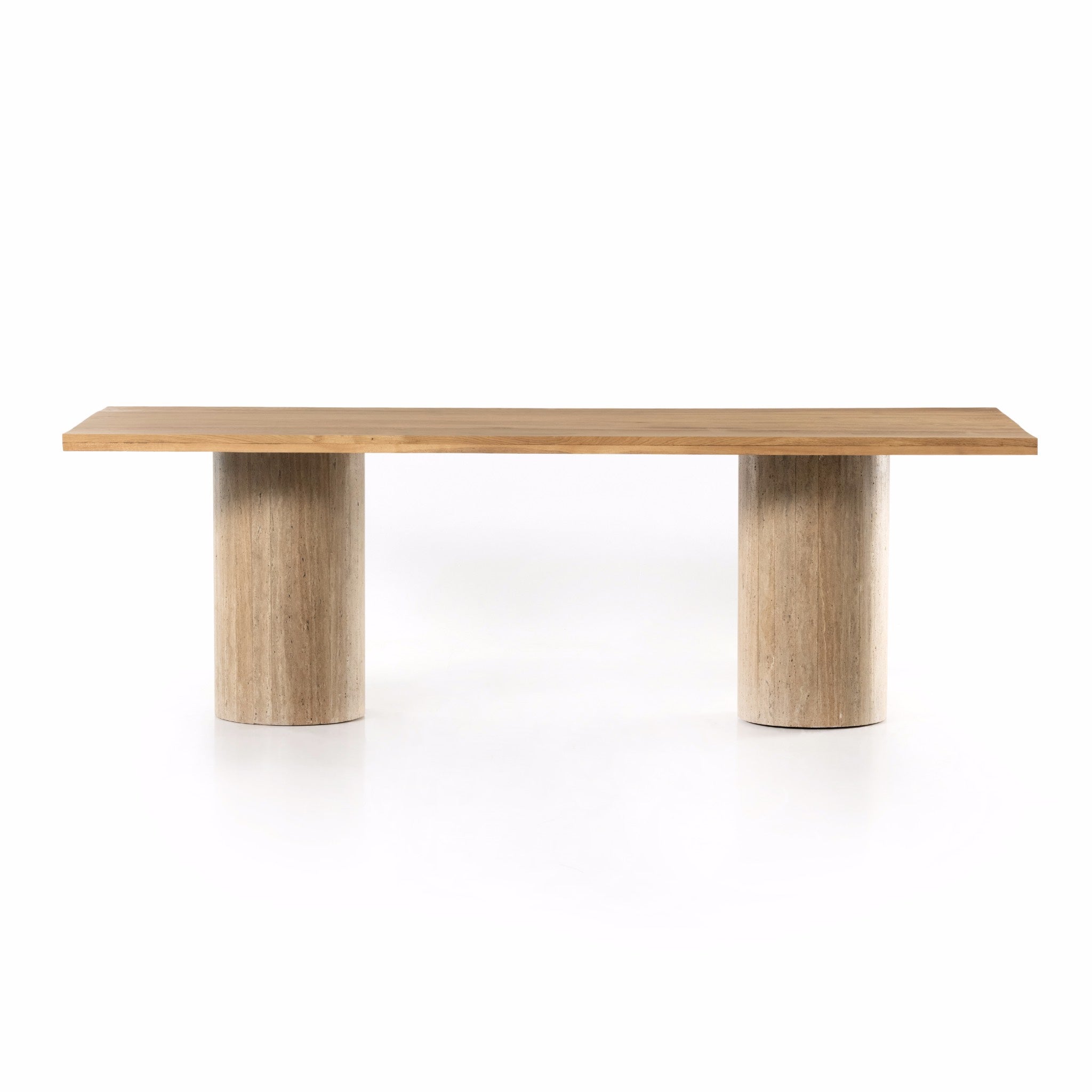 Make a mixed material statement. Cylindrical legs of solid travertine provide a dramatically scaled base for a rectangular tabletop of solid natural oak, for a fresh twist on organic Seventies styling. Seats six comfortably.