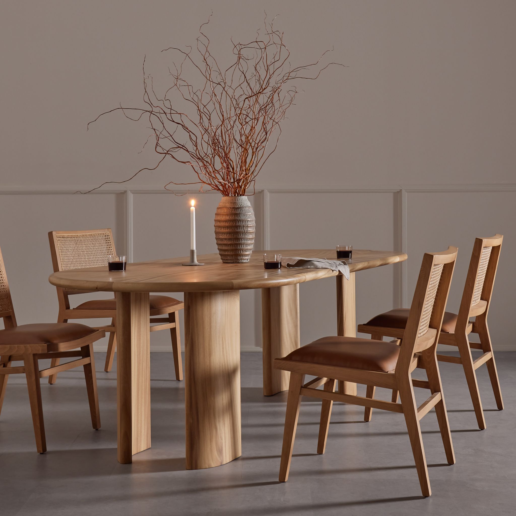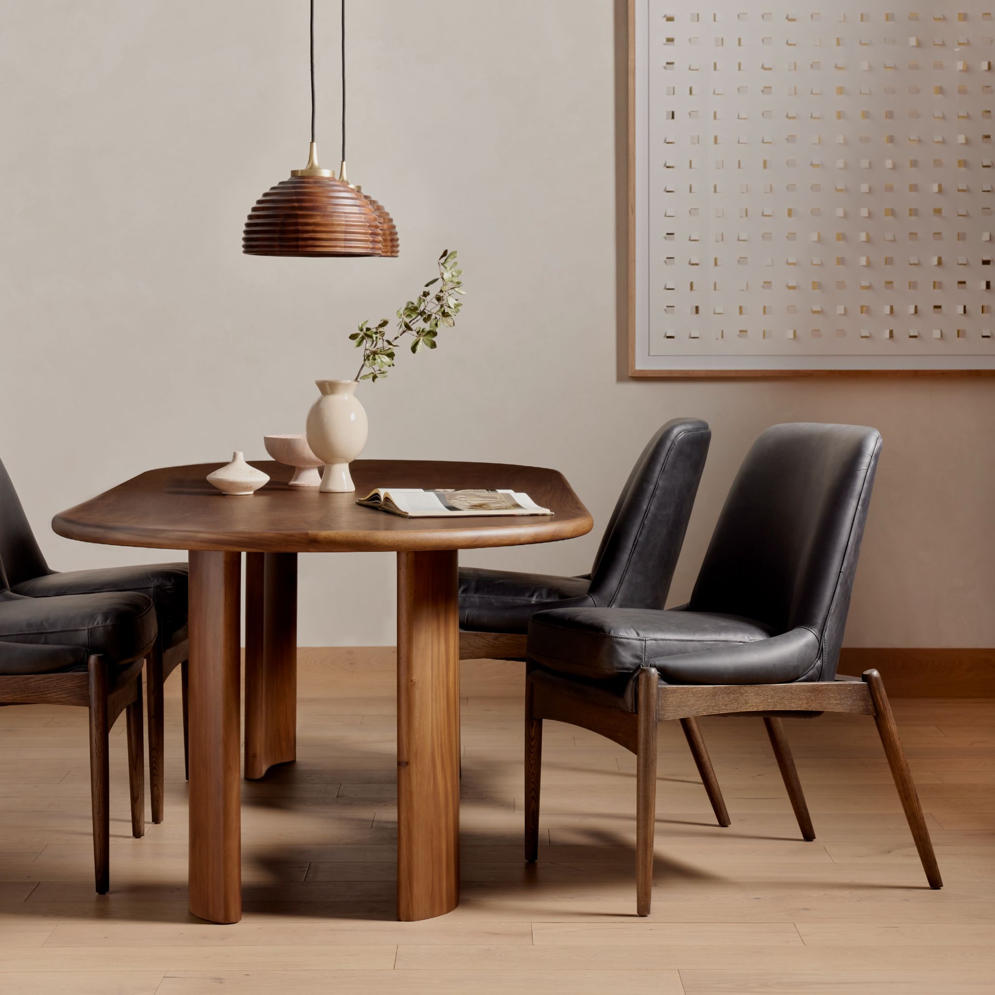 Gold or Carmel Guanacaste form a finely sculpted silhouette, with expressive grain patterning and book-matched veneer. Beautifully arched legs continue the curve of tonal-shaped tabletop for a rich look with generous movement.