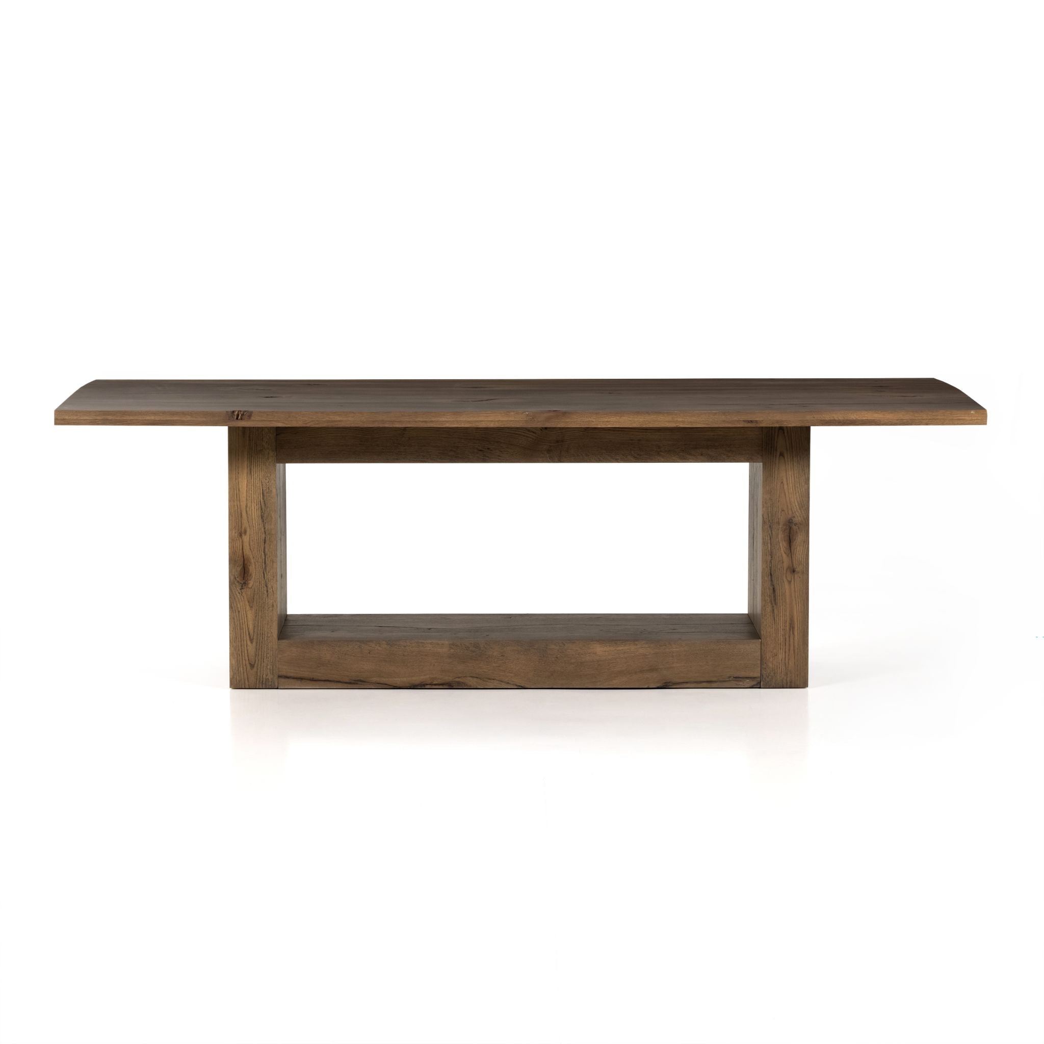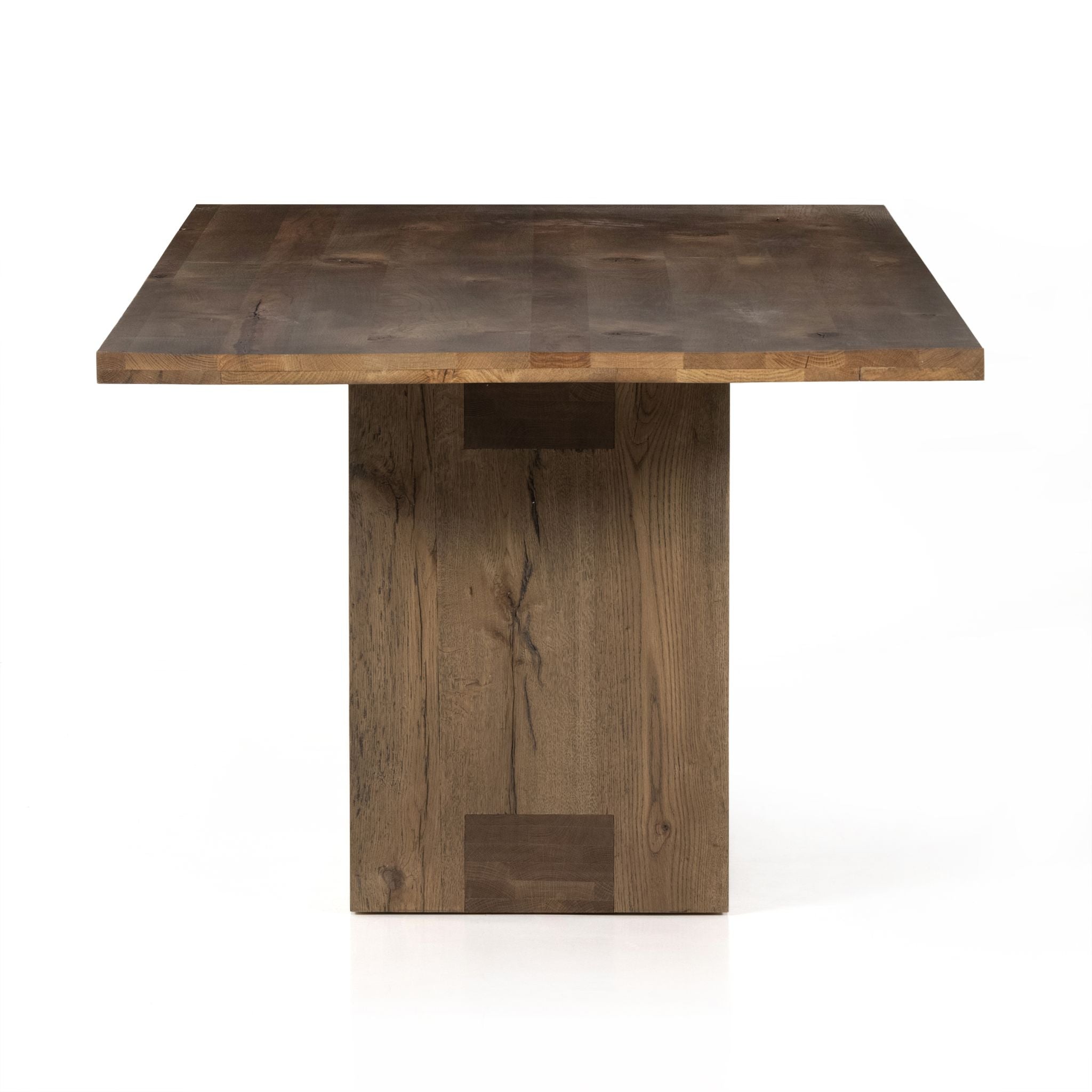 Plenty of presence packs into this grand dining table made from hand-selected oak veneer, with over scaled joinery for heft. Seats six comfortably.