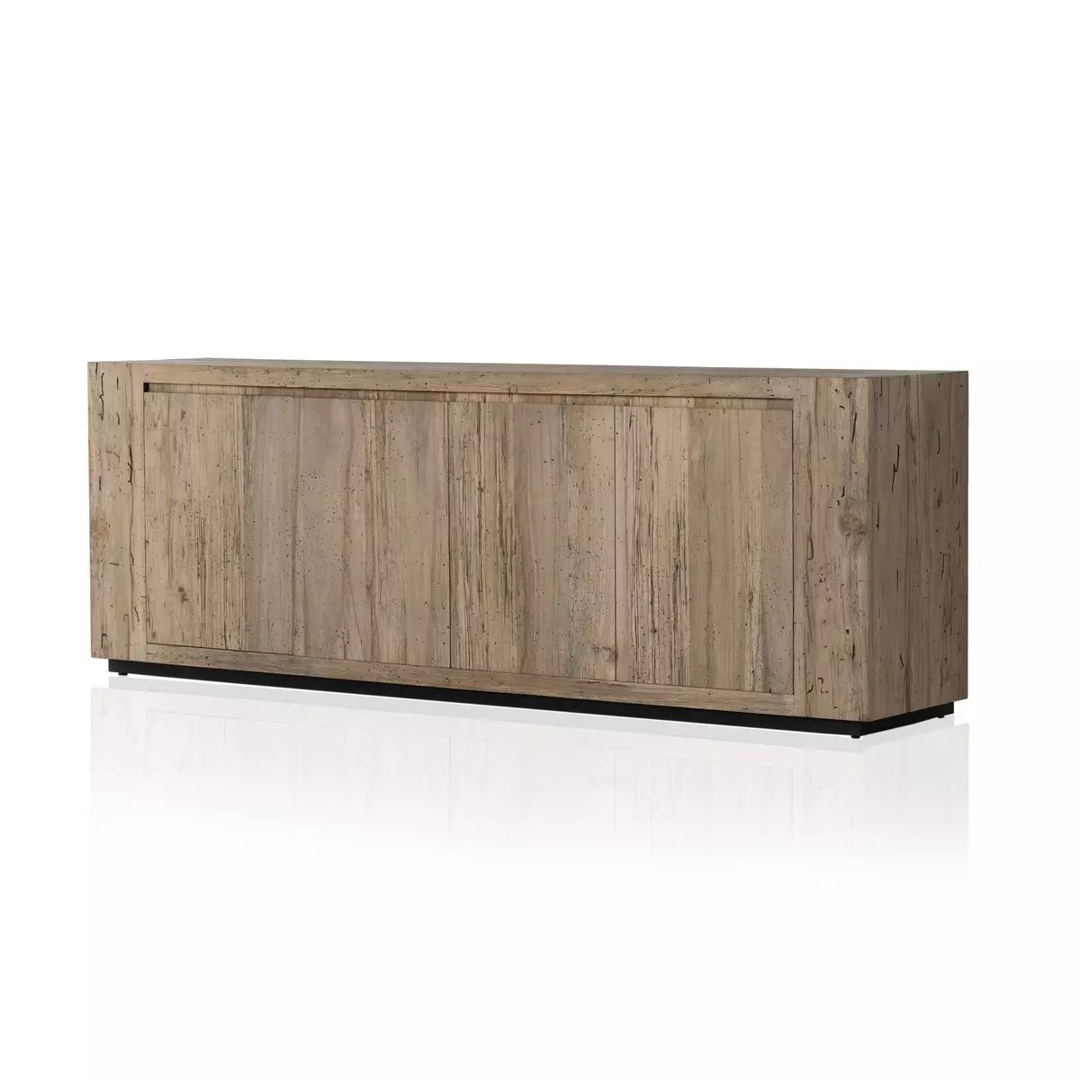 Made from thick-cut oak veneer with a faux rustic finish made to emulate wormwood, this low, large-scale sideboard features chunky squared legs and dovetail joinery detailing.