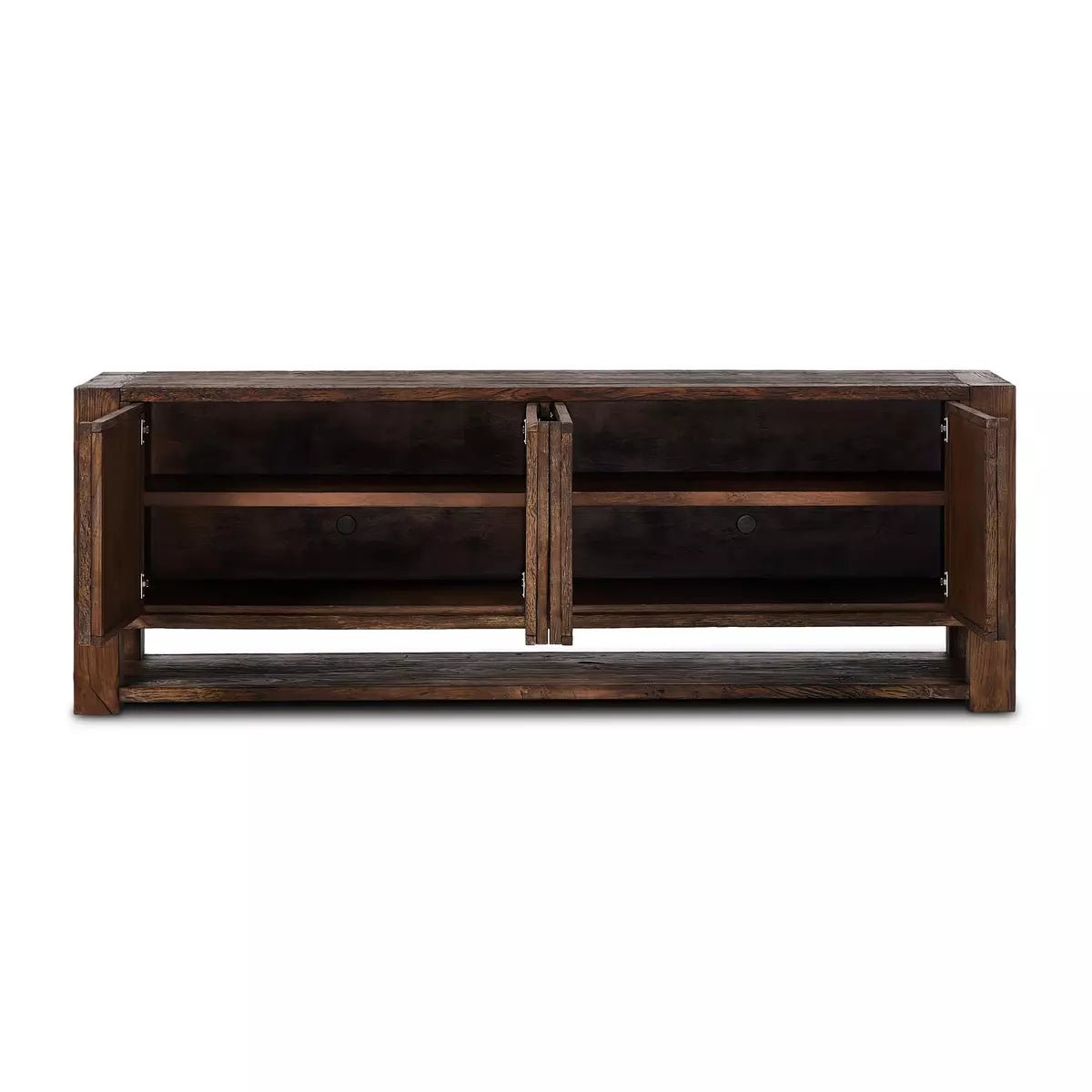 This rustic sideboard is wabi sabi-inspired with a simple framework accented with natural graining and grooves. Crafted from a mix of solid and resawn wood in a smocked finish with raised built-in door pulls for an easier grip.