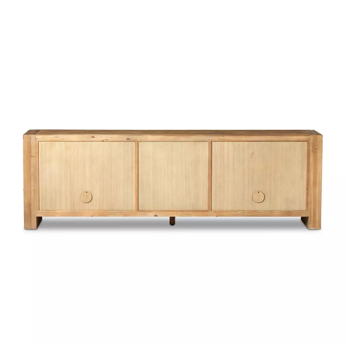 A large, waterfall-style sideboard inspired by Chinese antiques is made from solid pine with a light, distressed finish and butterfly joint connections. Rear cutouts for cord management.
