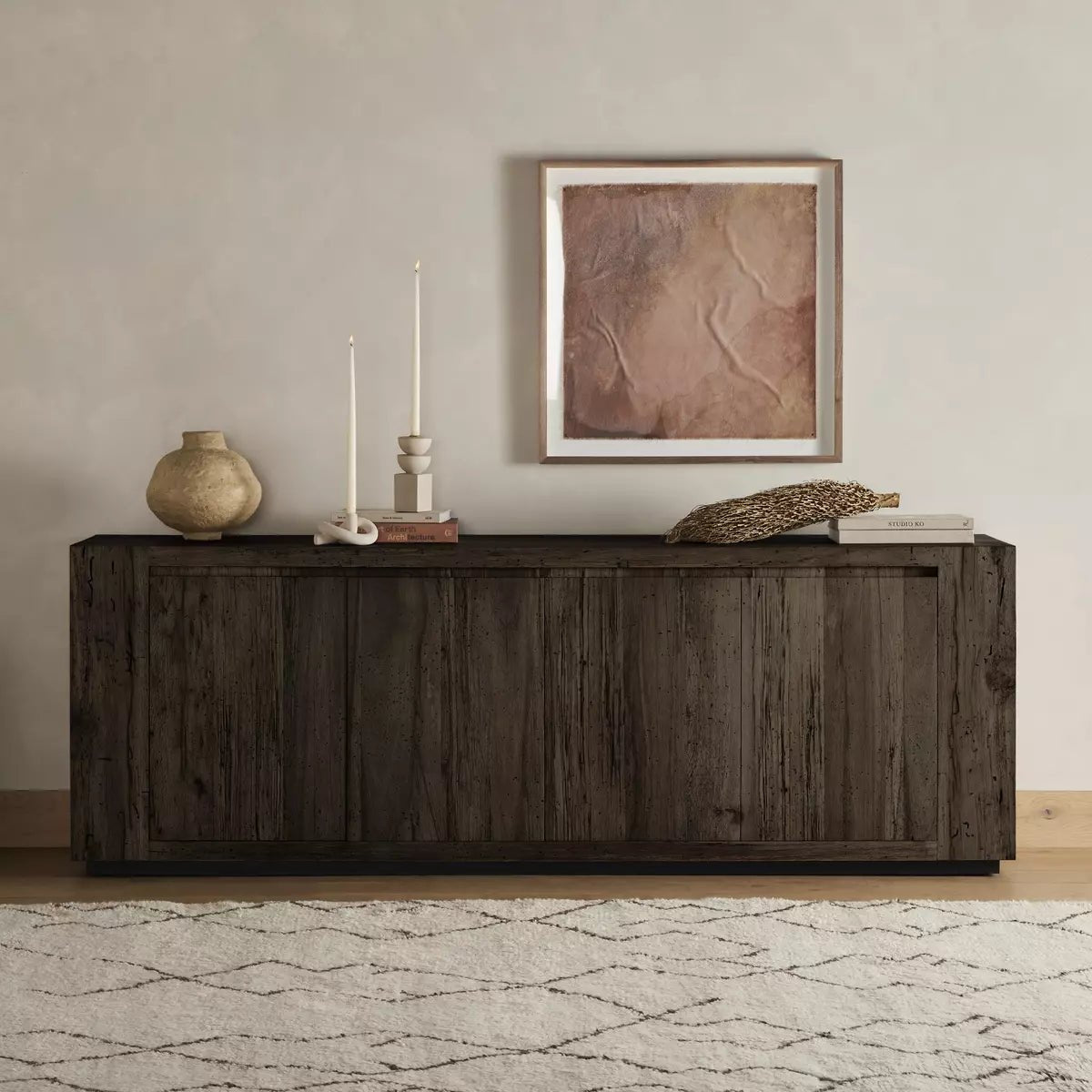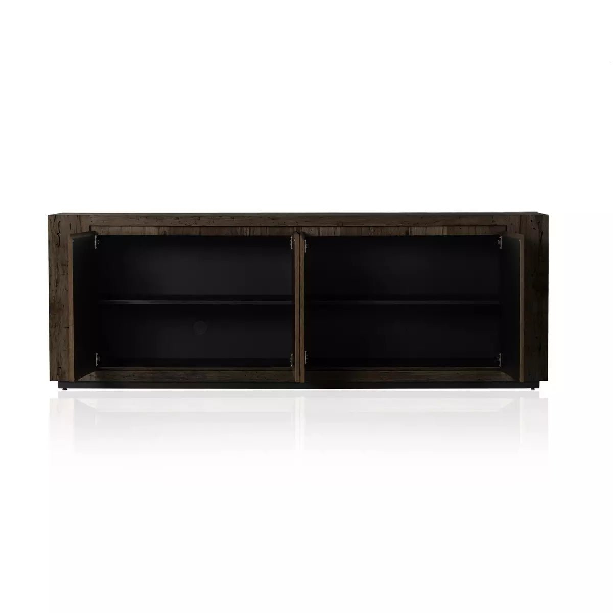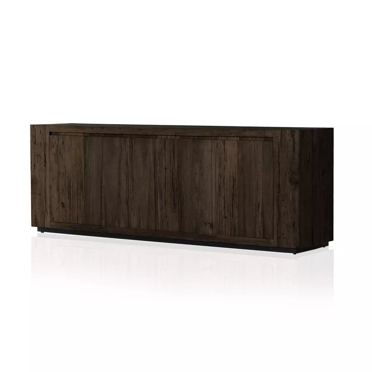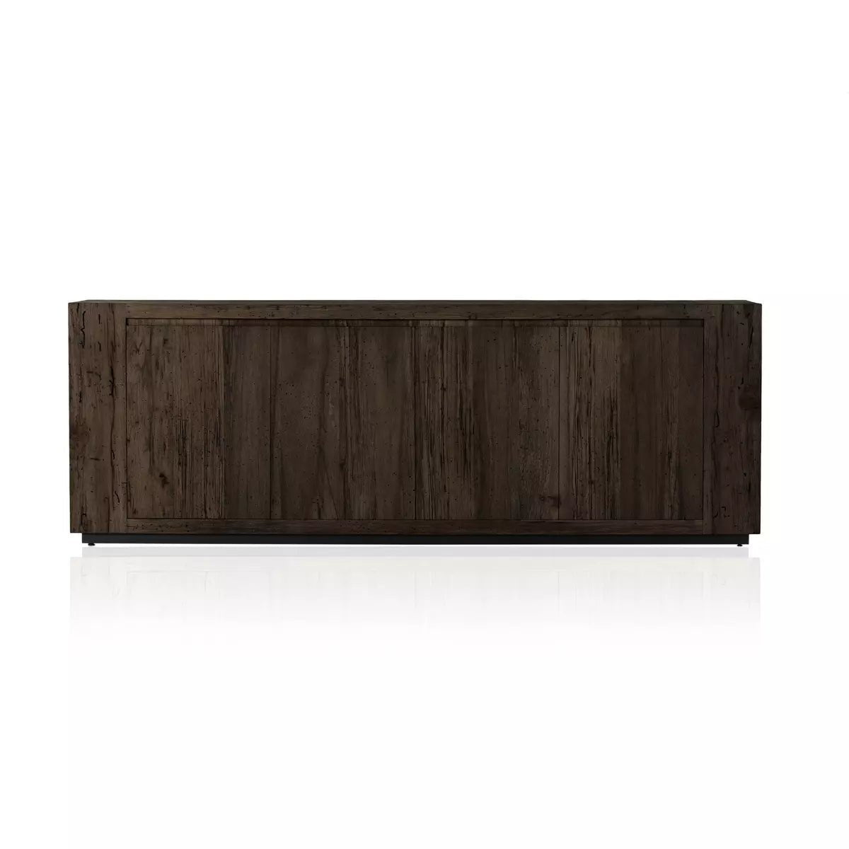 Made from thick-cut oak veneer with a faux rustic finish made to emulate wormwood oak, this low, large-scale sideboard features chunky squared legs and dovetail joinery detailing.