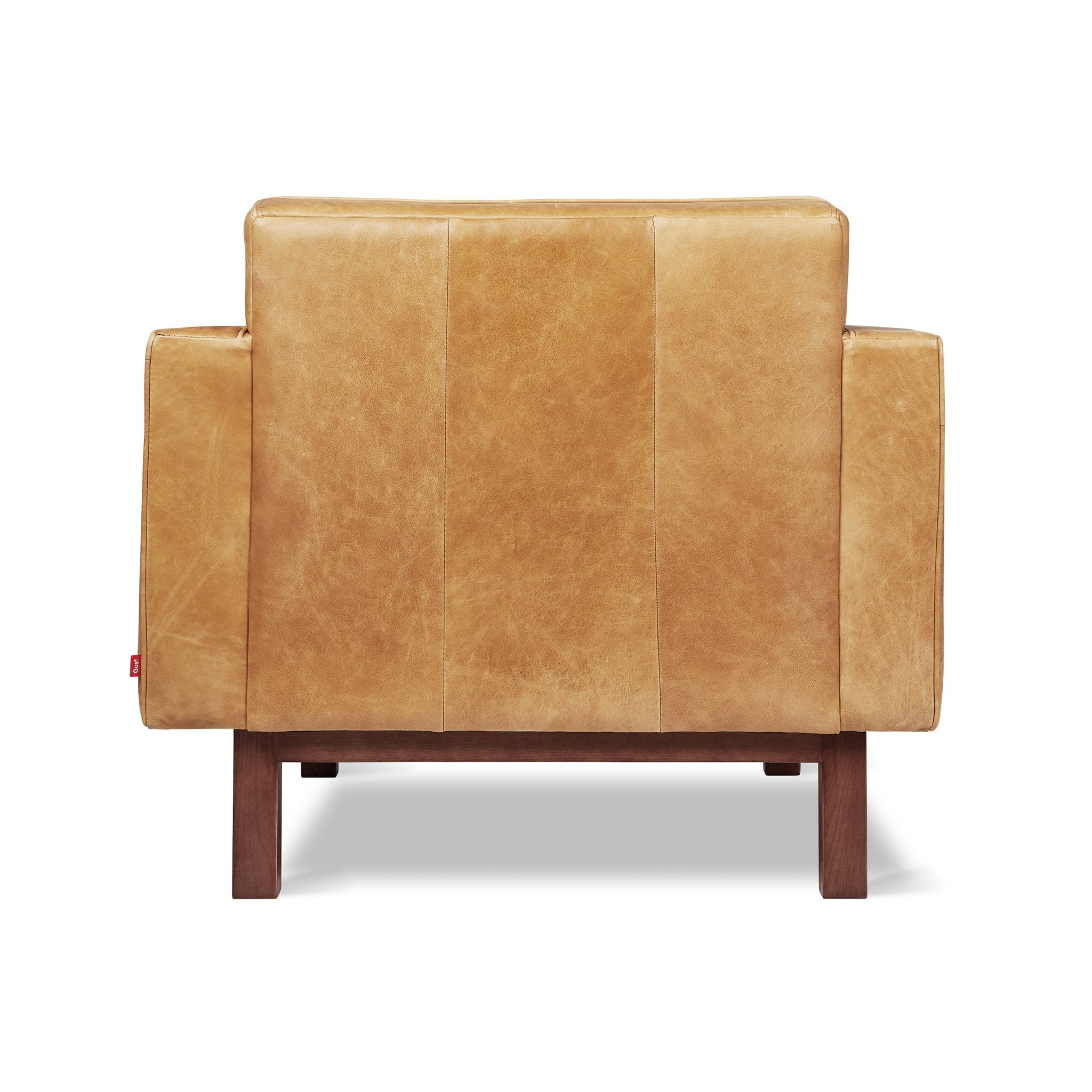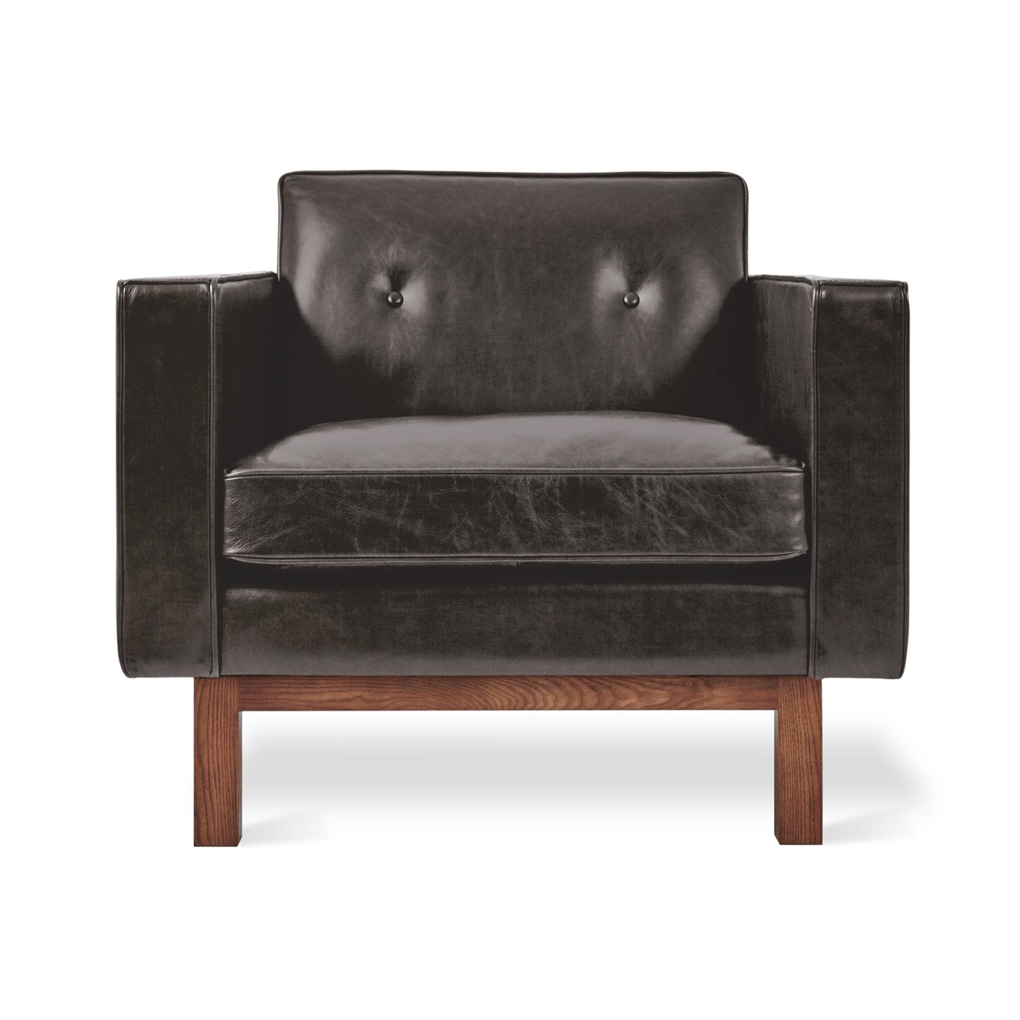 The Embassy Chair channels timeless mid-century style with its button-tufted back, refined proportions, and vintage leather upholstery. A tight, structured backrest and tailored piping add elegant detail, while a plush seat cushion wrapped in synthetic-down invites relaxation. Crafted with top-grain, aniline-dyed leather, each chair showcases natural grain variations and markings that develop a rich patina over time. A recessed walnut-stained wood base offers subtle architectural support. Built to last with high-resiliency foam and a kiln-dried frame, the Embassy Chair makes a sophisticated statement in any living space—and pairs perfectly with the Embassy Sofa.