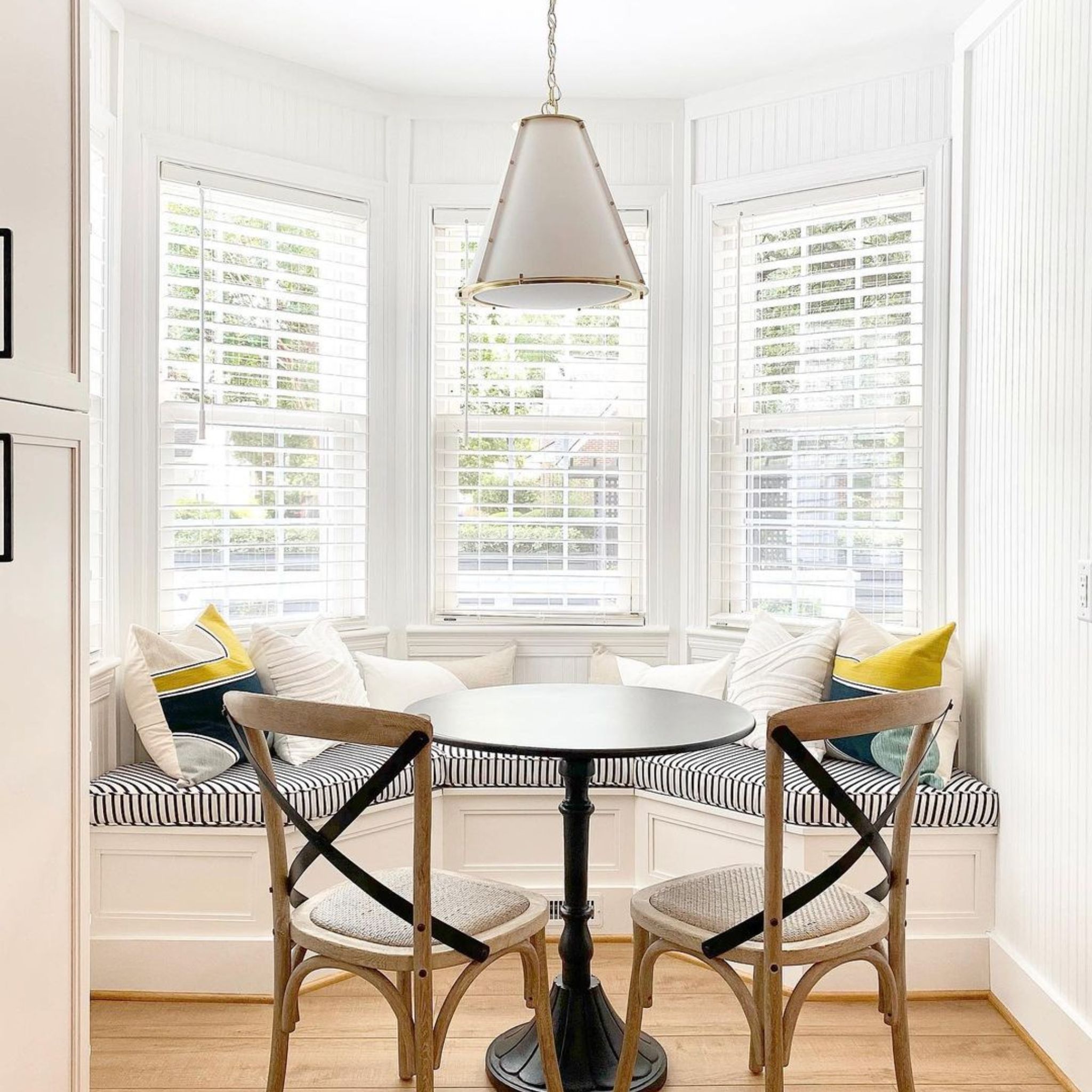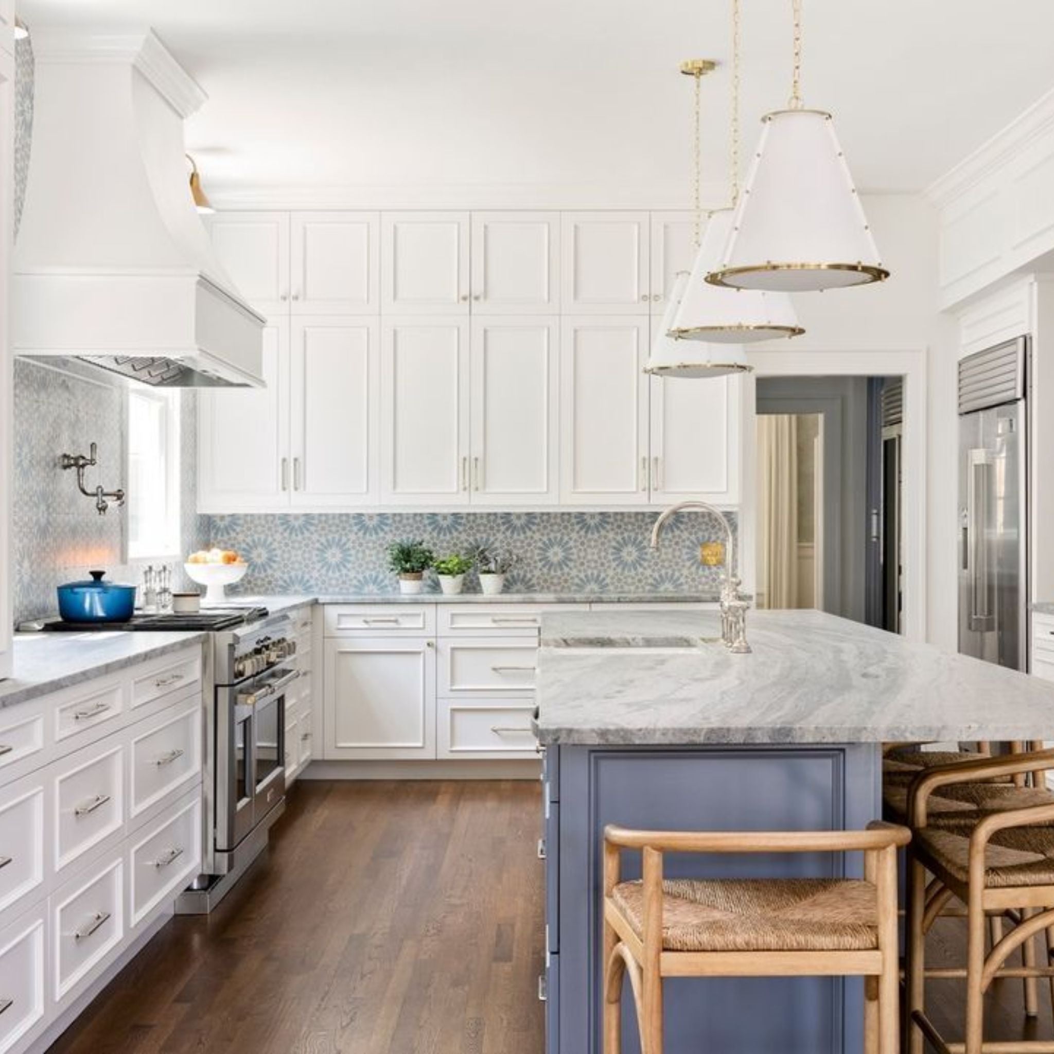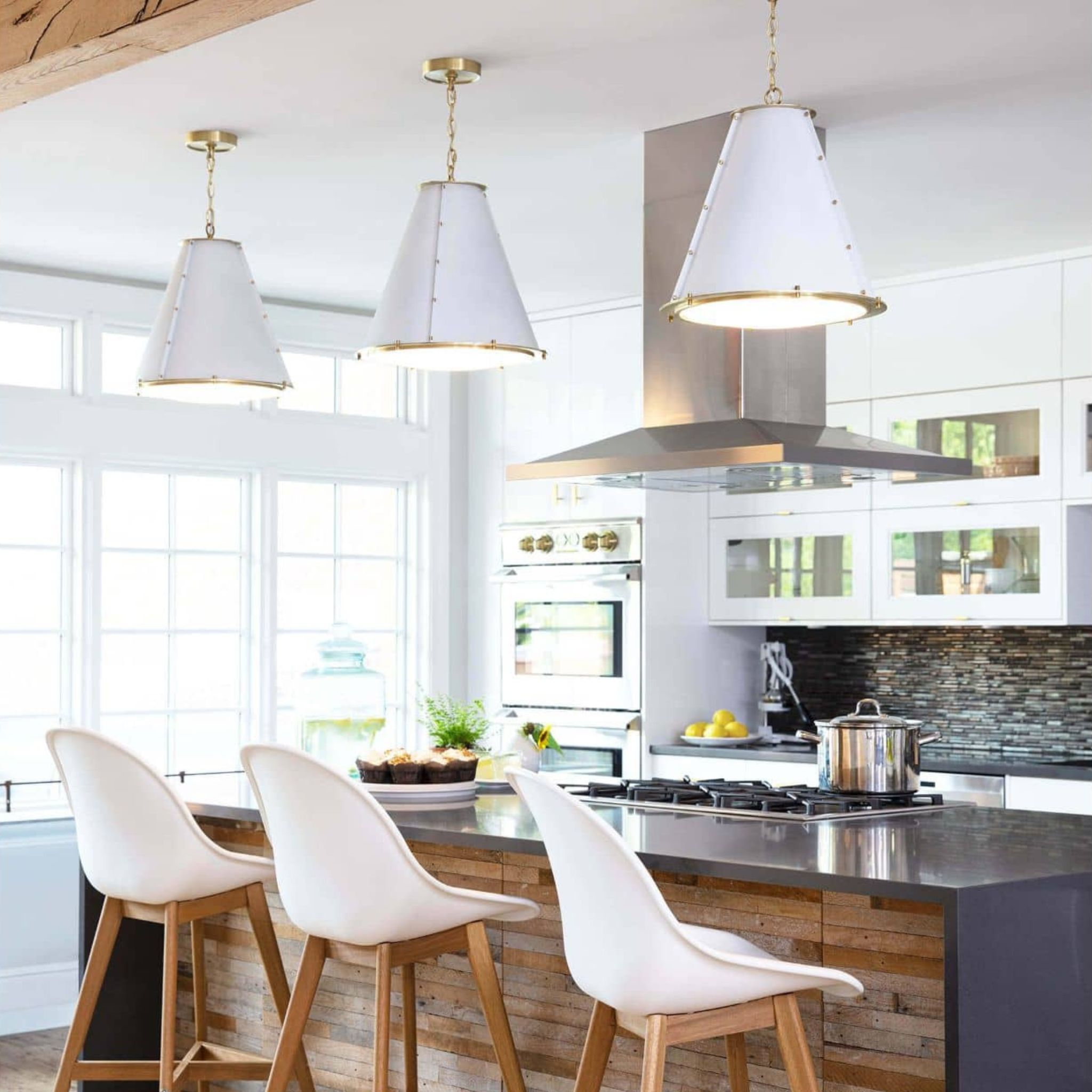 Bright and white, the French Maid chandelier has a simple cone silhouette that’s trimmed with natural brass detailing for an industrial edge. A diffuser shade provides nice ambient light for a kitchen island.
