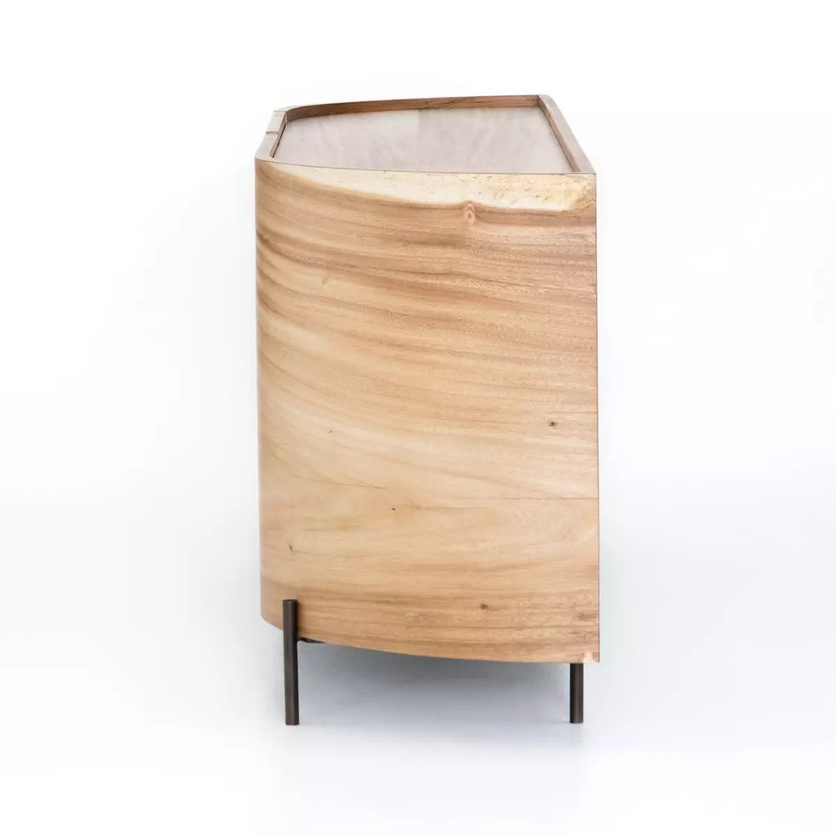 With soft shaping and inset top inspired by classic jewelry setting, gold Guanacaste forms a beautifully sculpted silhouette, with natural high and lowlights coursing the entirety of this richly styled sideboard.