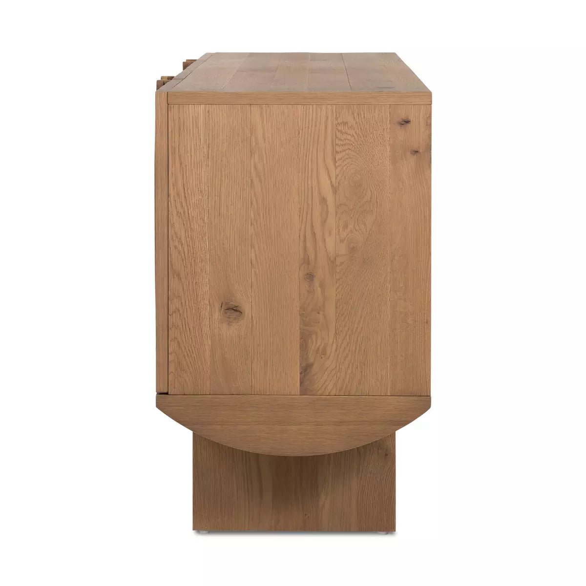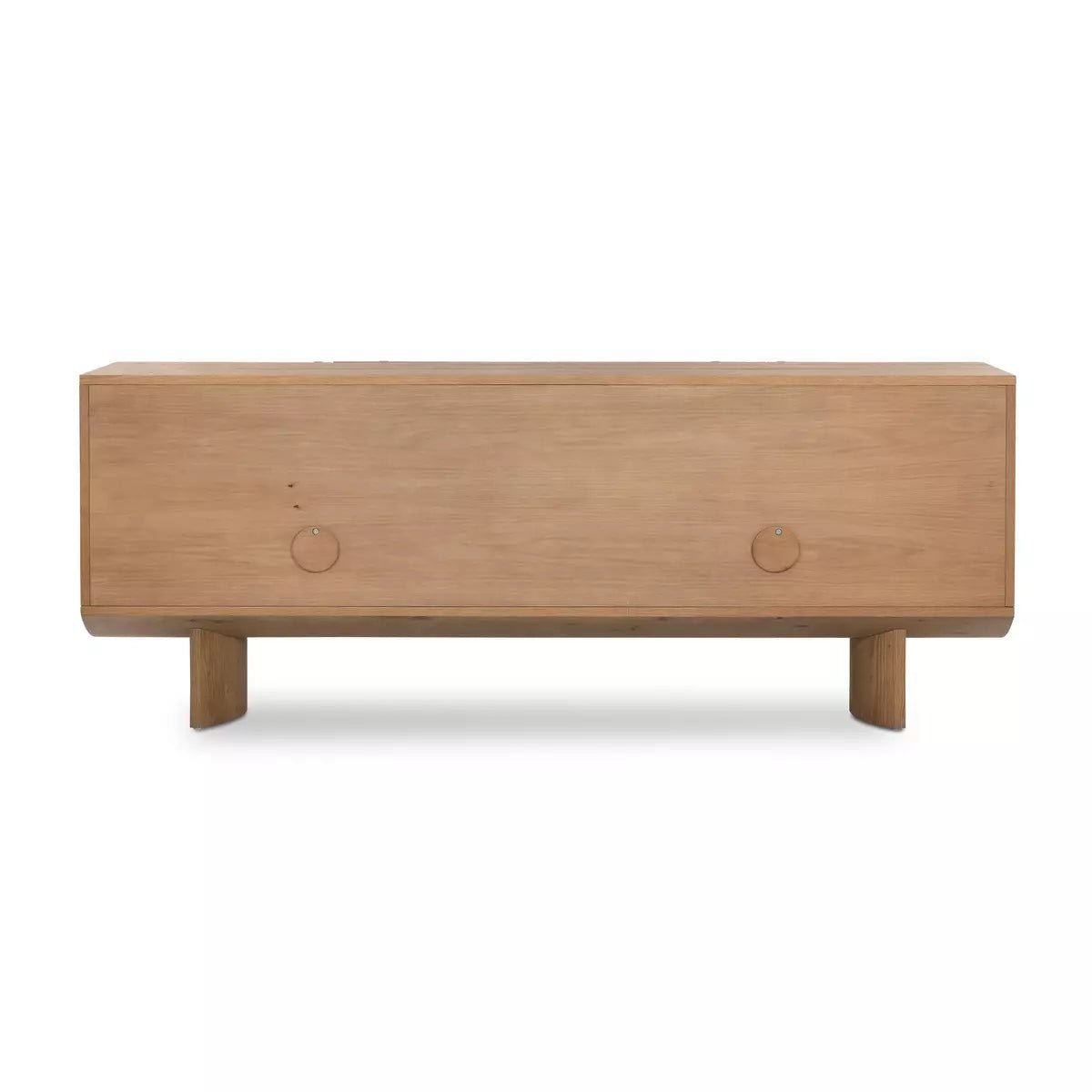 Made from thick oak veneer, a shape-driven sideboard features overscale proportions, semicircle shaping and hand-applied half-moon hardware. Dual posterior cutouts for seamless cord management.