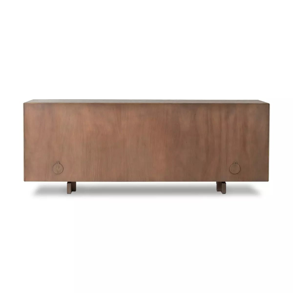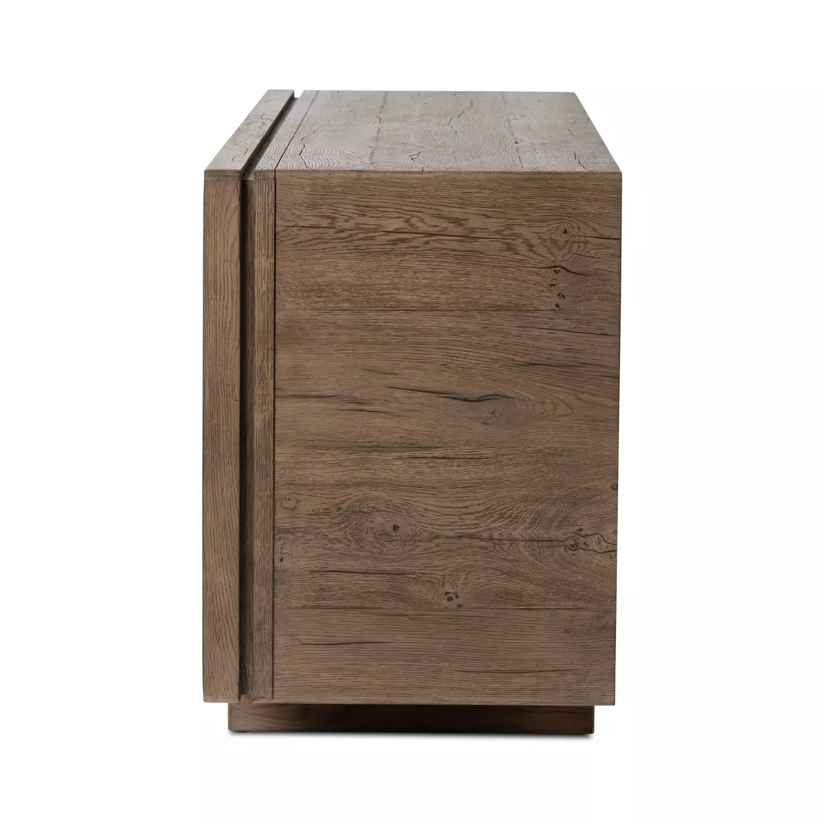 Made from solid reclaimed oak finished in a rustic grey, natural wood grooves and chamfered framing elevate this sideboard, perfect for storing serving ware and table linens. Center drawers, side shelving, plus rear cutouts for cord management.