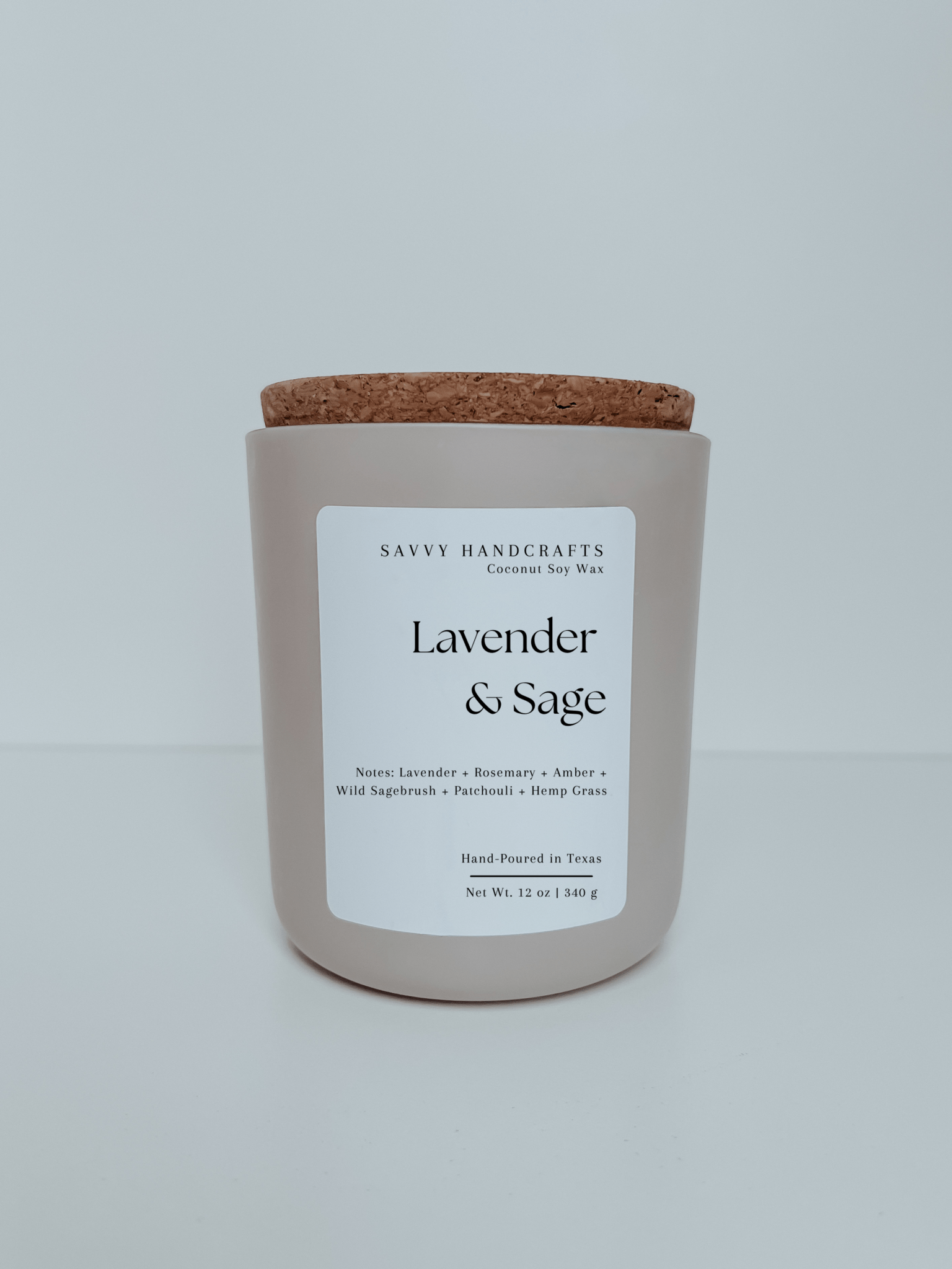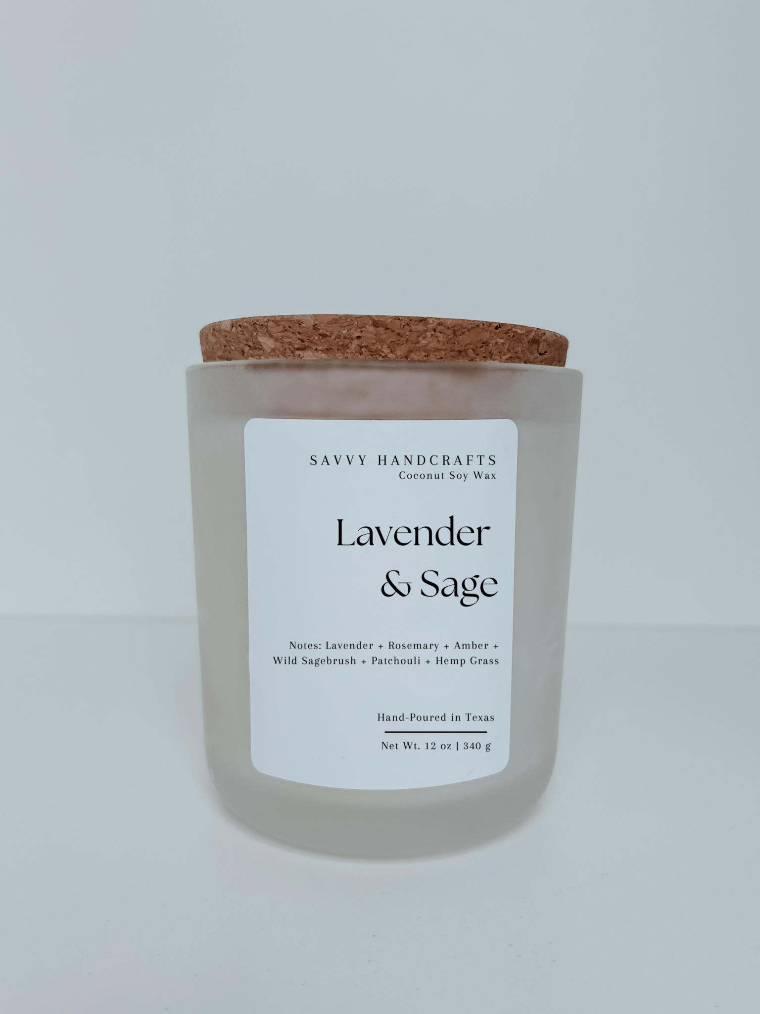 Indulge in the calming blend of Lavender & Sage with our 12oz candle. Let the soothing scents transport you to a place of relaxation and peace. Perfect for self-care or creating a tranquil atmosphere in any room. Experience the benefits of aromatherapy with our Lavender & Sage candle. Fragrance Notes: * Lavender + Rosemary + Amber + Wild Sagebrush + Patchouli + Hemp Grass Specifications: * Our 12oz vessels are made of glass with an external matte finish * Measurements are 3.75 in (w) x 4.1 in (h) * Burn time is approximately 50 hours * Double cotton wicks * Coconut Soy Wax (gluten, toxin, paraben, and phthalate free)