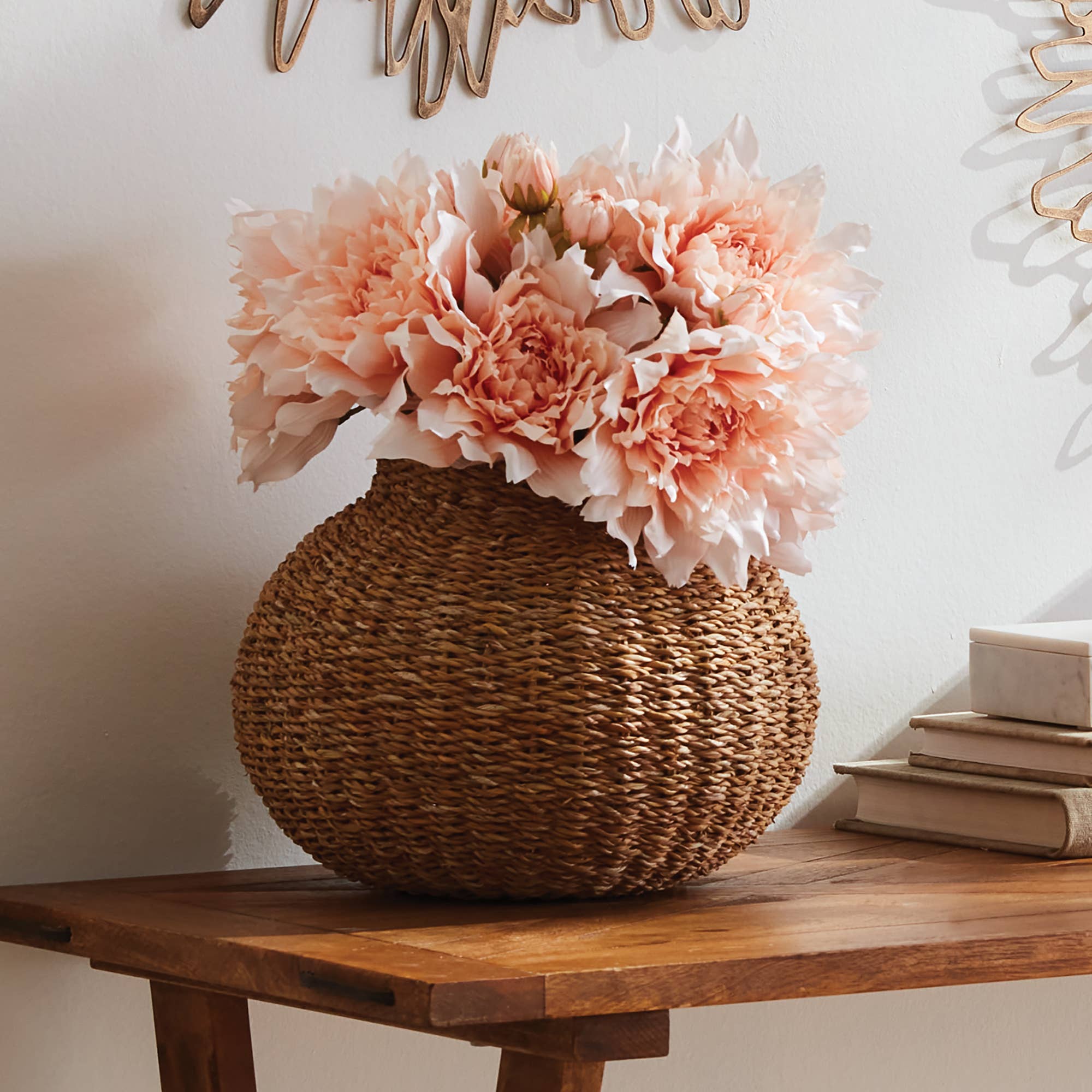 Seagrass is naturally supple, not stiff. Beautiful in color as well as texture. This round vase is solidly constructed with an iron frame to keep it's shape. A nice complement to a tall faux stem. Color: Natural. Not watertight. Interior use. Dust with soft cloth. Do not clean with harsh chemicals. Like you, we believe in the beauty of home.