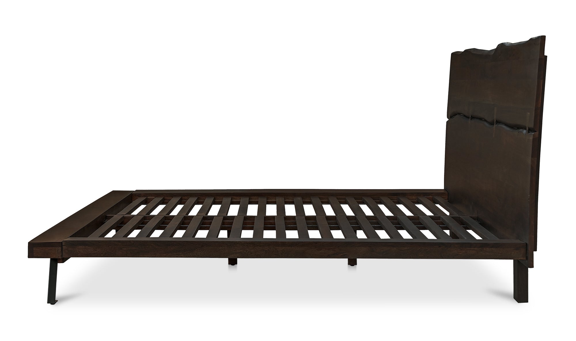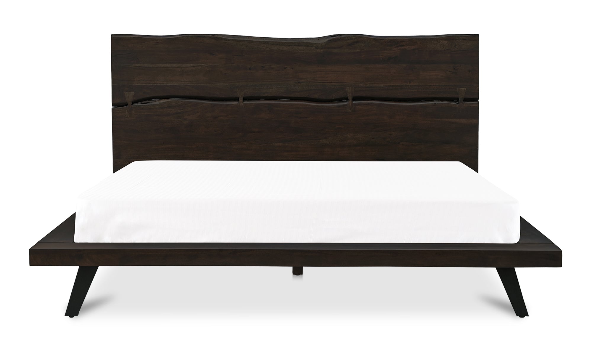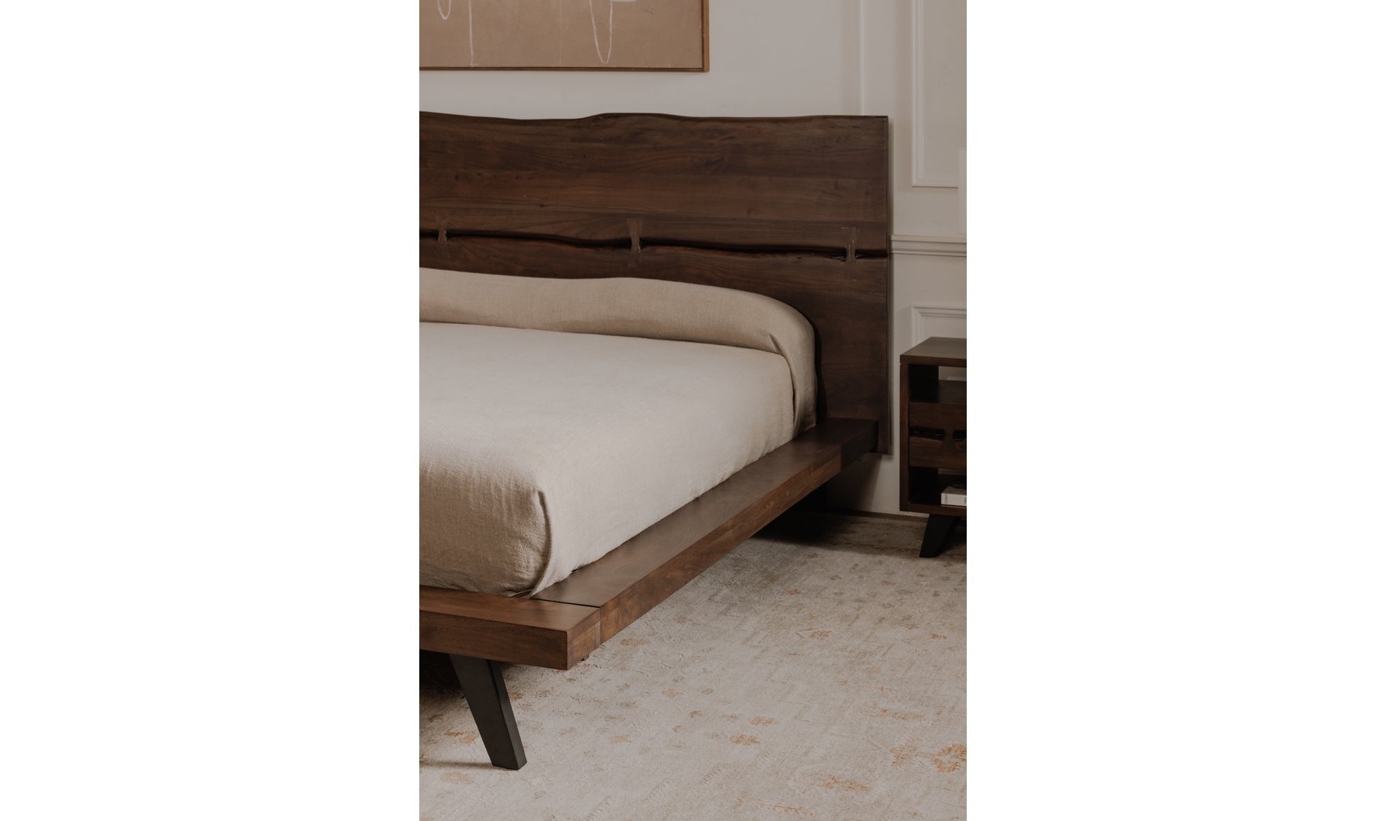 Solid acacia wood frame with angular, powder-coated steel legs. Organic live edge headboard with butterfly joinery