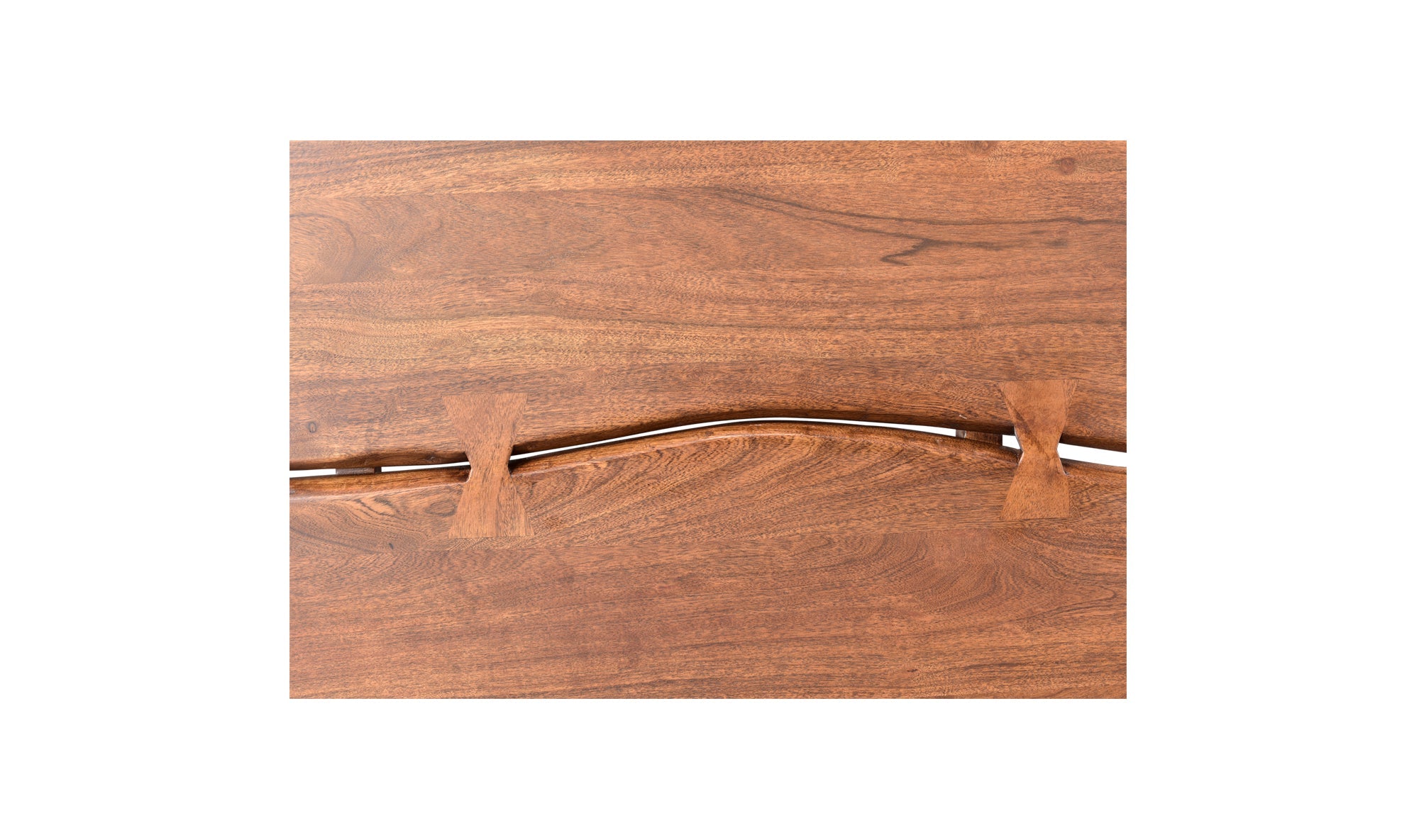The Madagascar platform bed is a sublime fusion of nature's tranquility and modern sophistication. Crafted from solid Acacia wood, this bed showcases a low platform design accentuated by an organic edge headboard, masterfully joined using the intricate butterfly woodworking technique with the entire bed supported by solid steel legs in a black powder-coated finish, elevating its rustic-industrial allure.