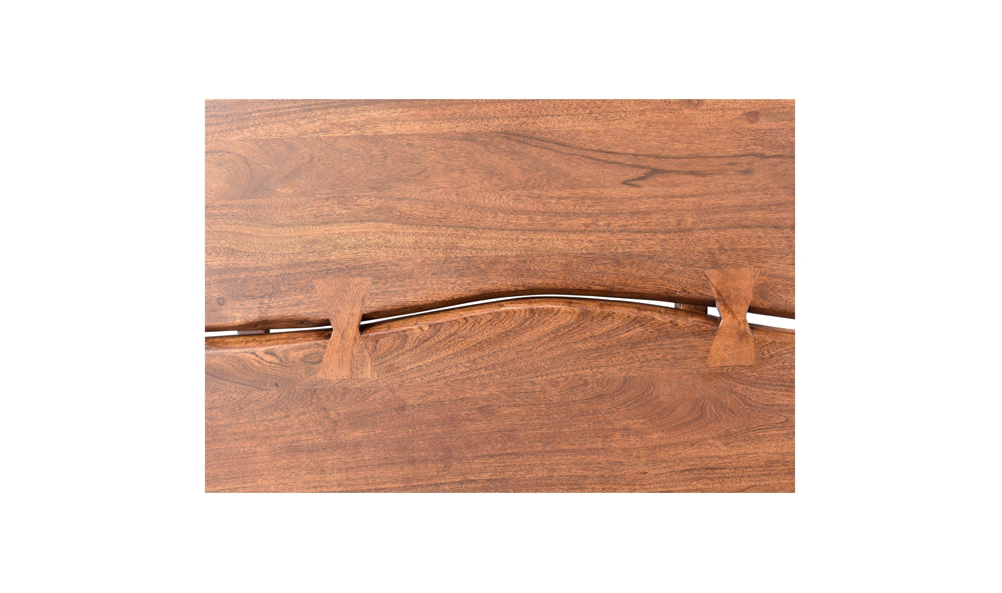 The Madagascar platform bed is a sublime fusion of nature's tranquility and modern sophistication. Crafted from solid Acacia wood, this bed showcases a low platform design accentuated by an organic edge headboard, masterfully joined using the intricate butterfly woodworking technique with the entire bed supported by solid steel legs in a black powder-coated finish, elevating its rustic-industrial allure.