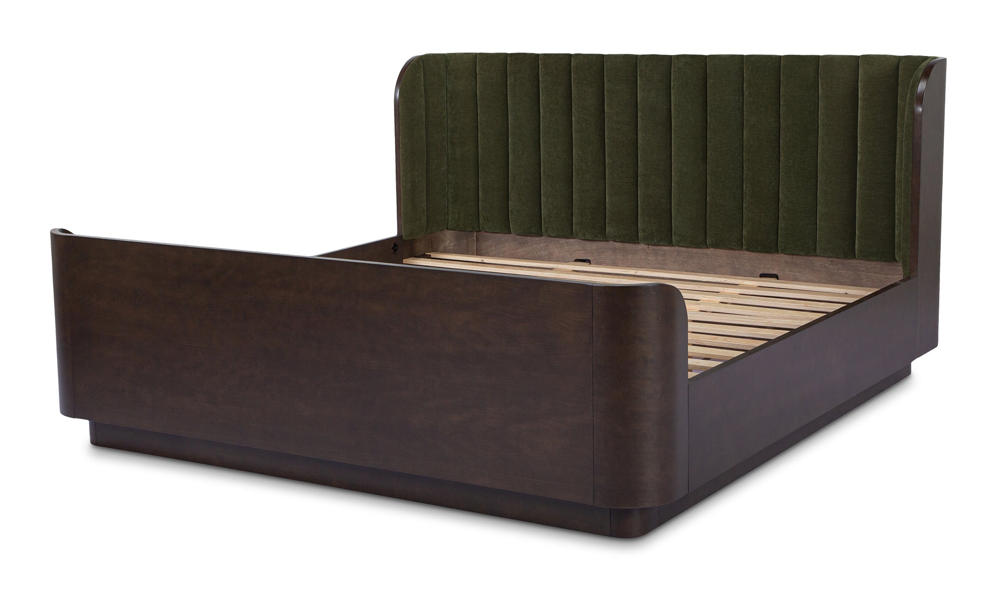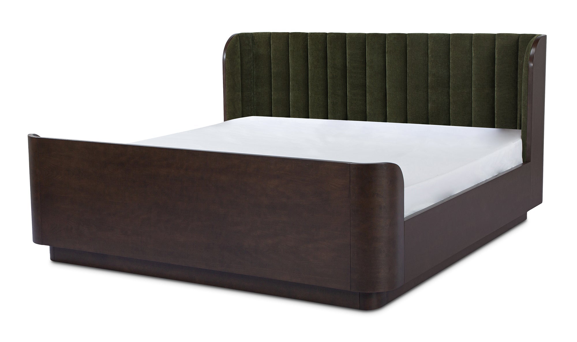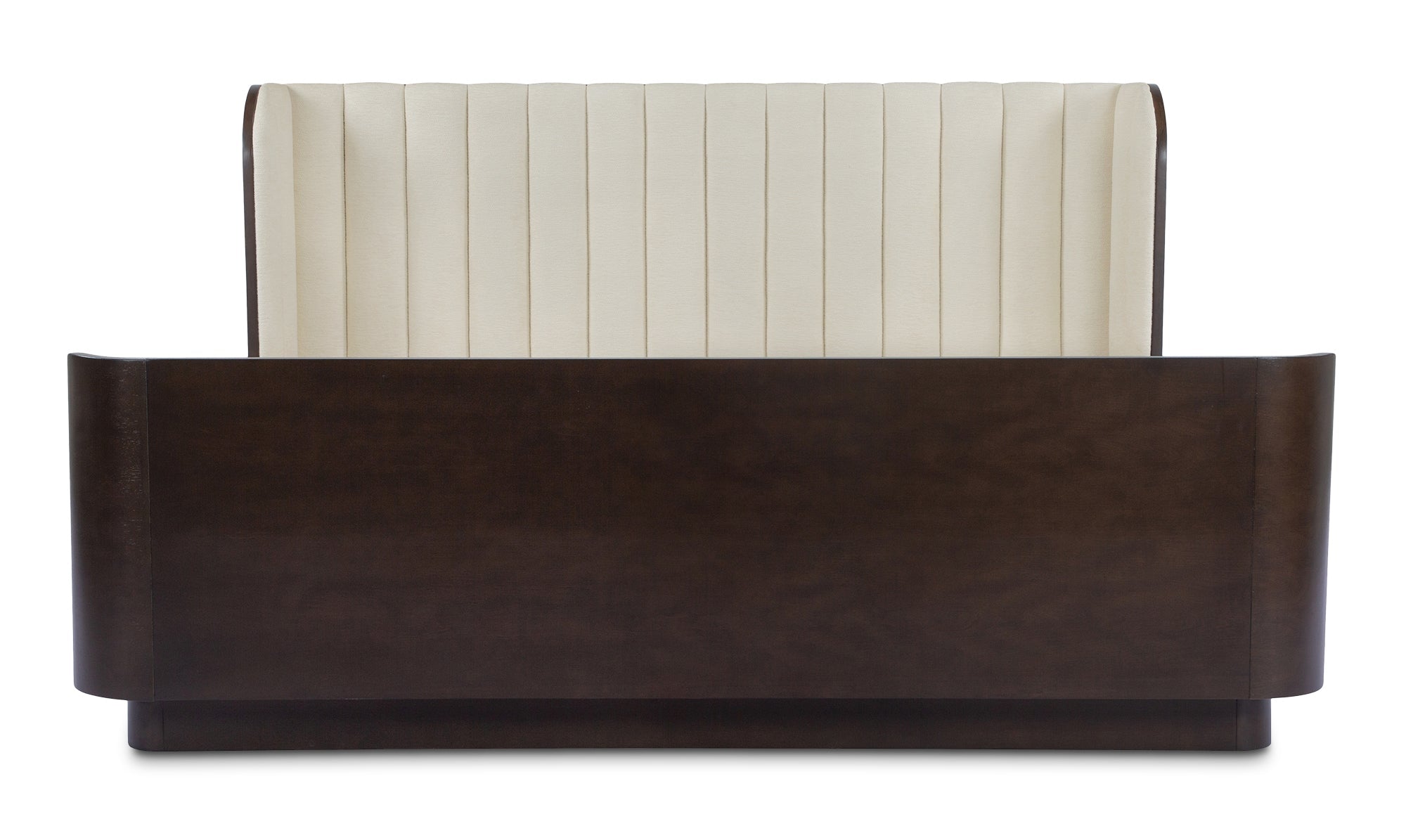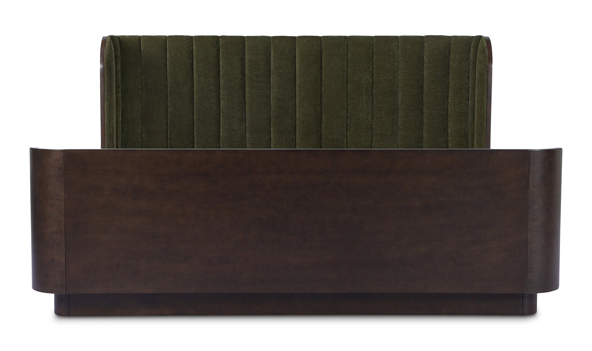 Curved cocoon-like headboard creates a cozy, enveloping feel
