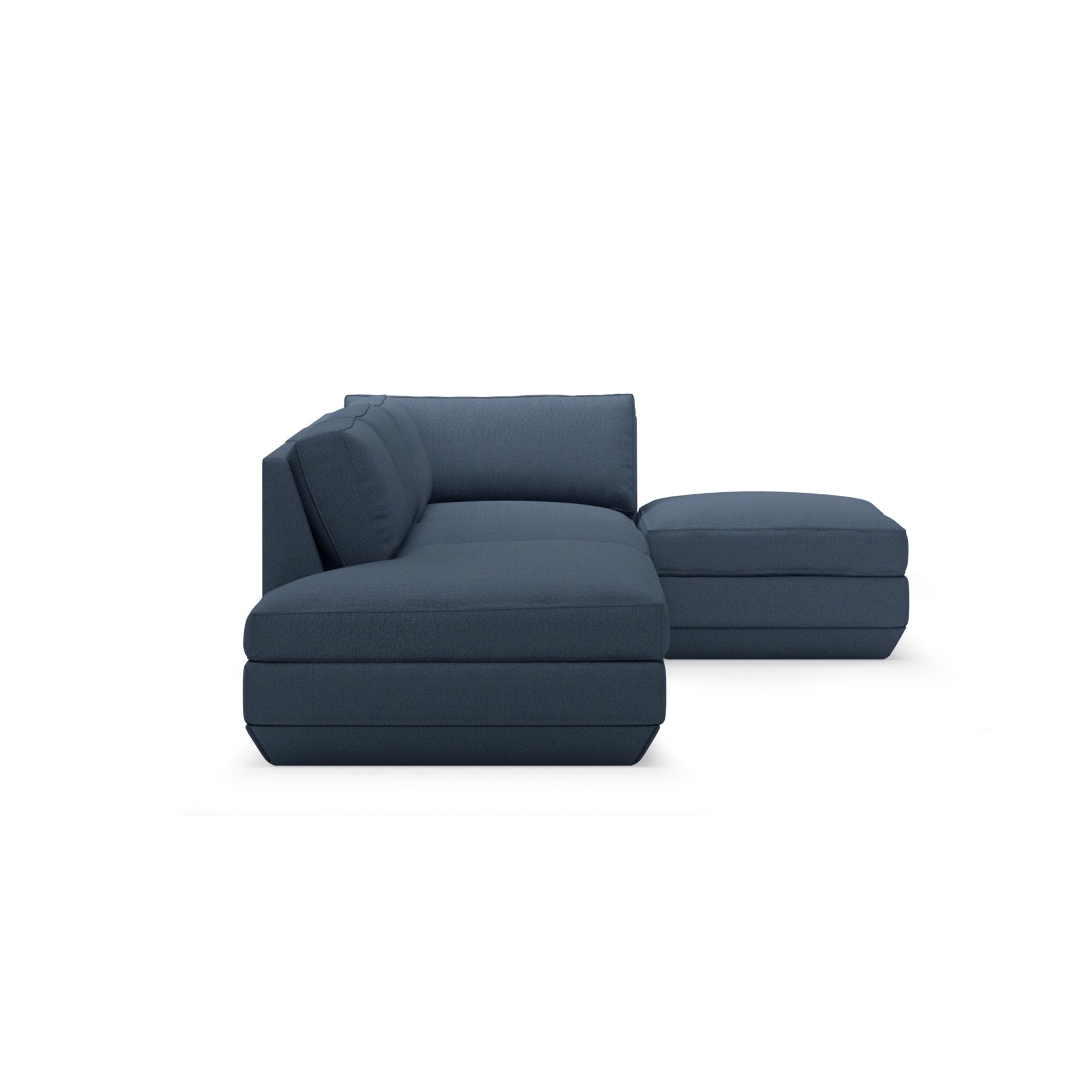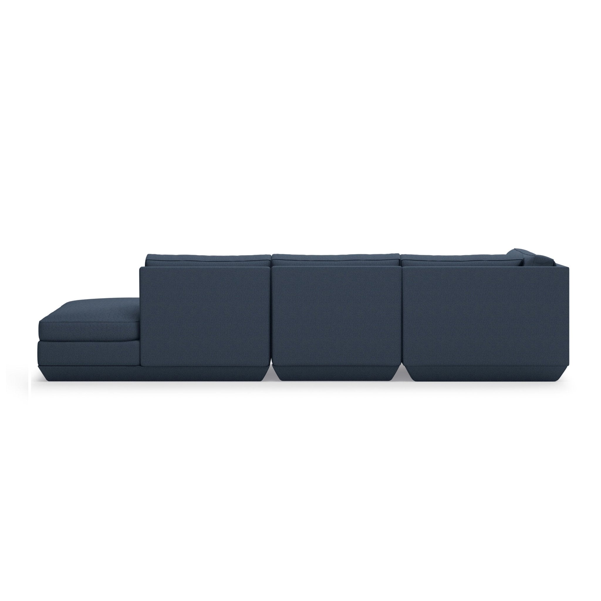 The Podium Modular 4PC Lounge Sectional B offers a spacious, lounge-worthy configuration that blends 1970s-inspired design with modern sustainability. Featuring a low, deep sit and plush cushions filled with ultra-soft synthetic down (made from 1,967 recycled plastic bottles per sectional), this piece delivers exceptional comfort while supporting environmental stewardship. Its chamfered base and relaxed silhouette add architectural elegance, while the modular design allows for future expansion or reconfiguration. Crafted with FSC®-Certified hardwood and built to meet California TB117-2013 fire safety standards—without flame retardants—this sectional is as responsible as it is refined.