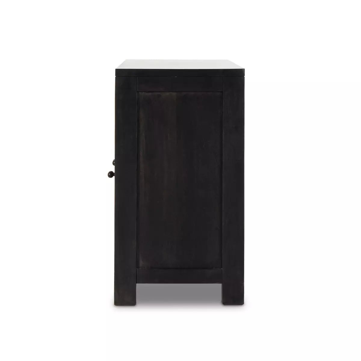 Grand in scale and presence. Black-washed mango encases arched cane door panels featuring black-finished iron hardware, meeting a forward-thinking material mix with monochromatic vibes.