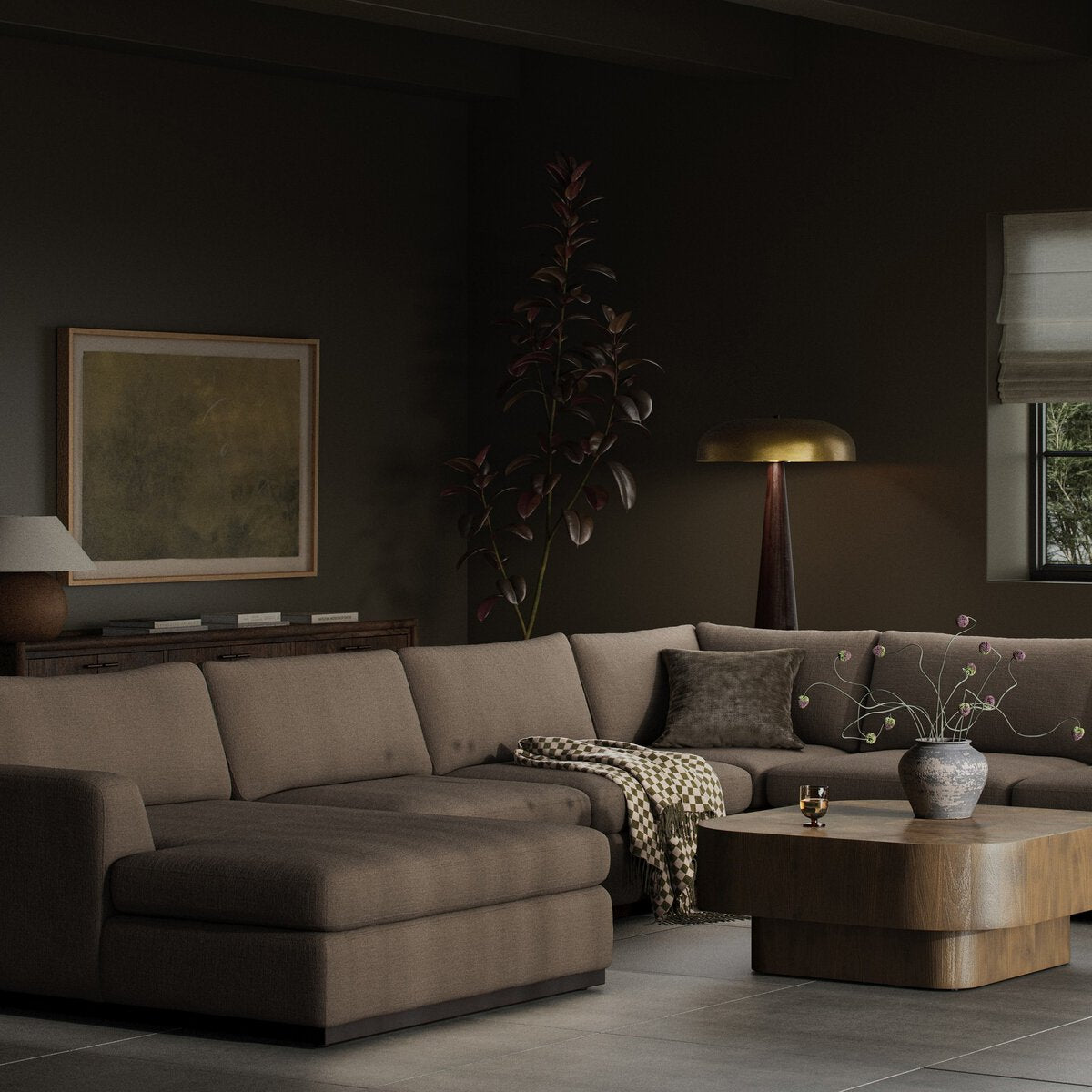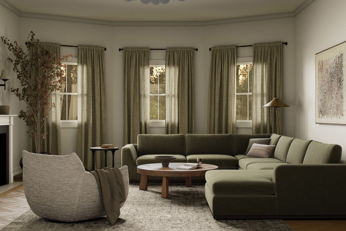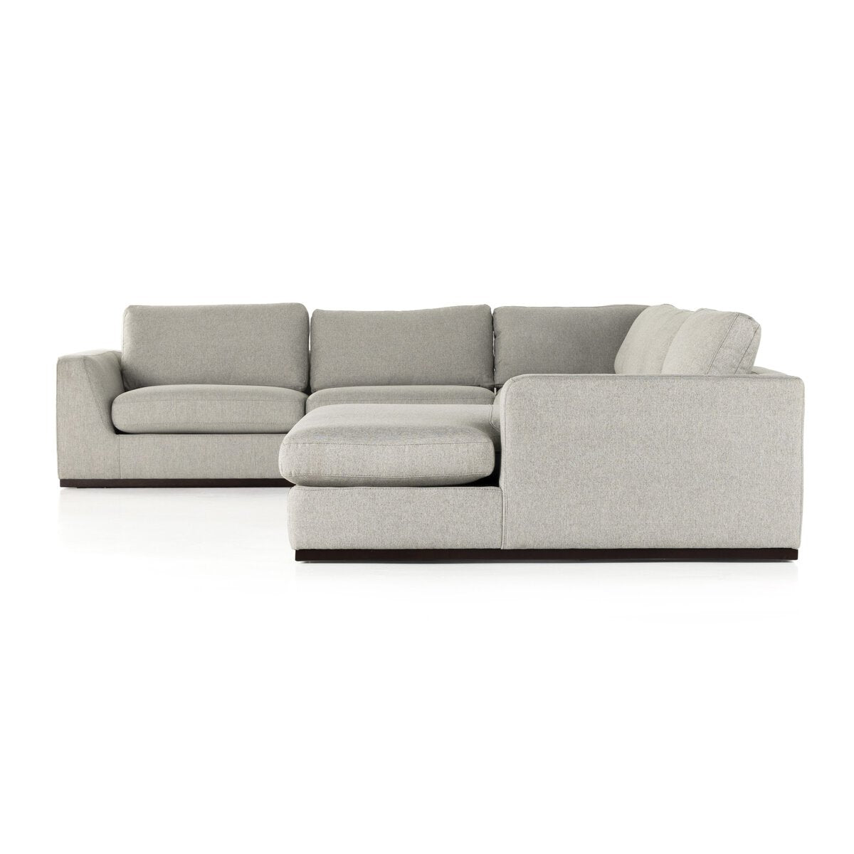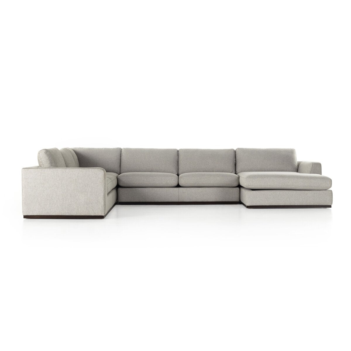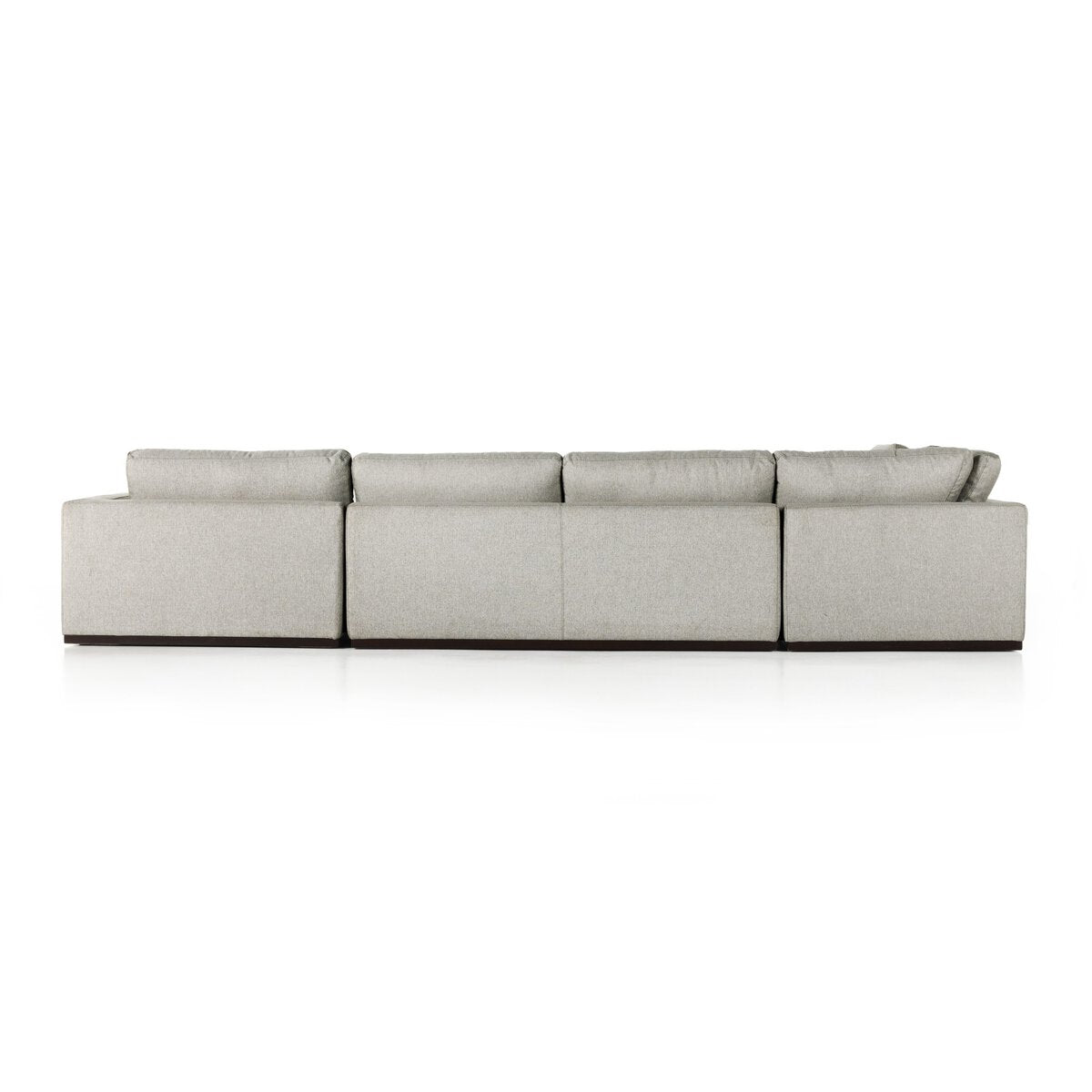 A four-piece sectional is upholstered in Crypton® performance fabric, specially engineered for protection against stains, moisture and odor. Due to the customized nature of made-to-order pieces, no cancellations or returns are accepted.