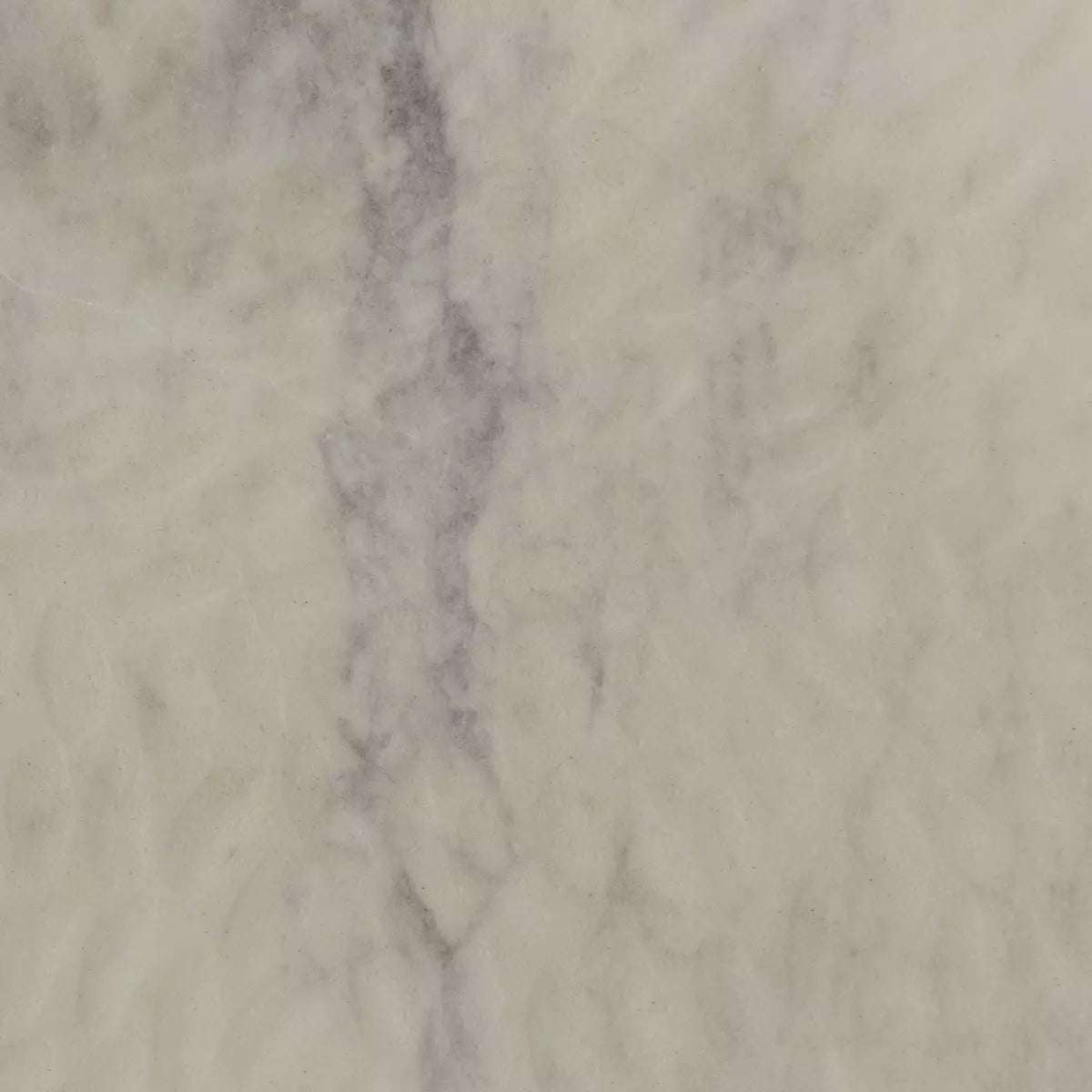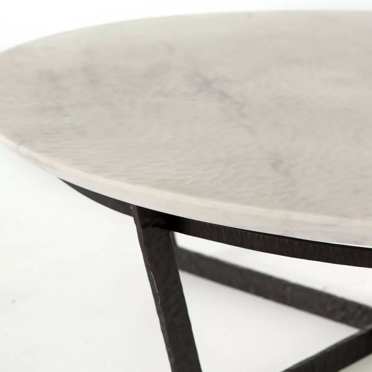 A raw, rustic iron base supports a round, white marble top, which is sandblasted for texture and polish.