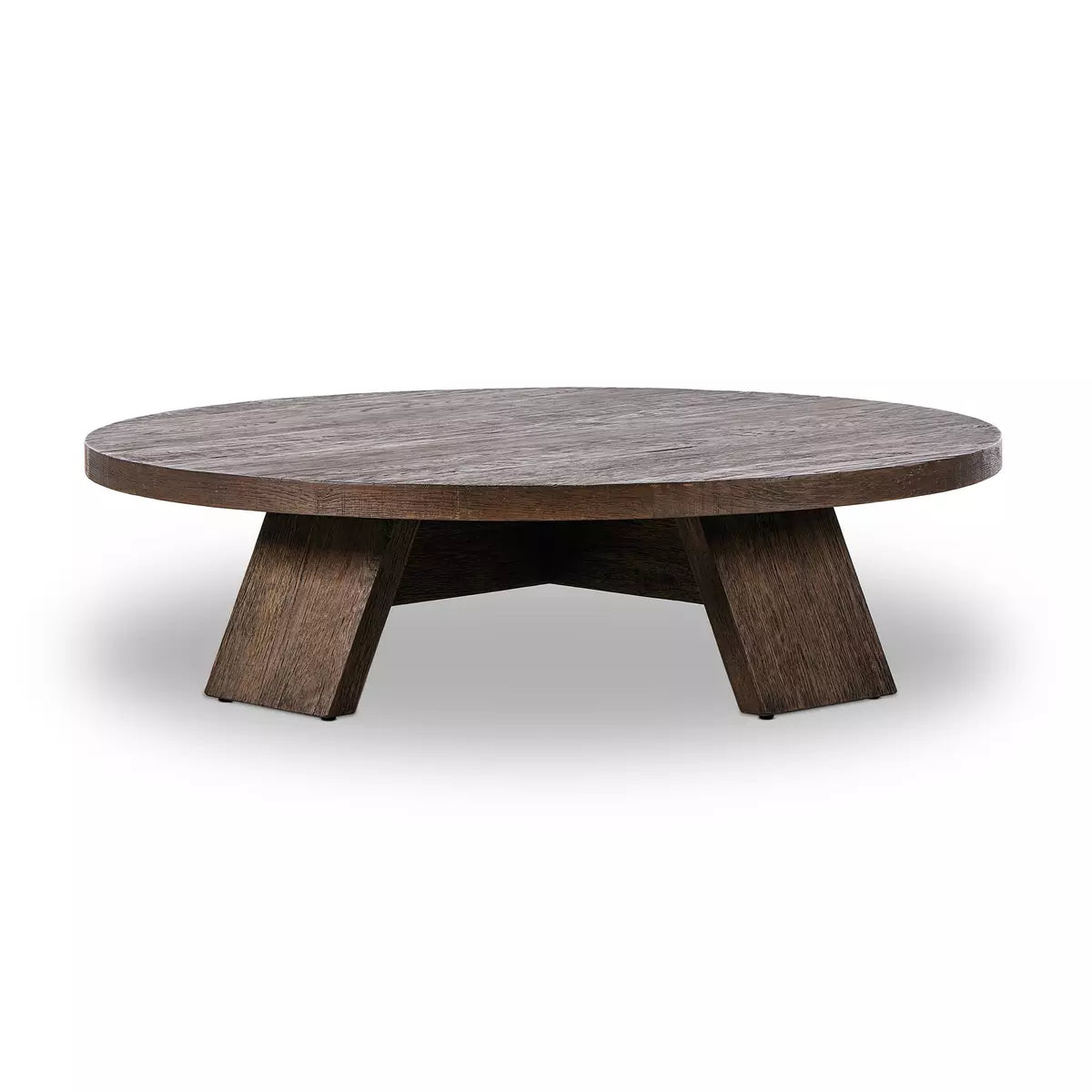 Made from character-rich resawn oak, a simple, rounded coffee table features splayed legs for a hint of shapely intrigue.