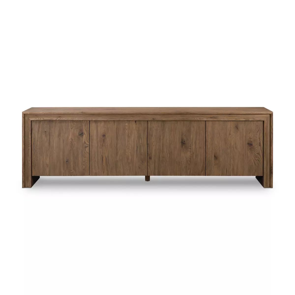 Anchored by a wide, stately frame with clever relief detail, this media console celebrates the natural beauty of oak. Push-latch doors create a clean, modern profile, placing emphasis on a warm, weathered finish.