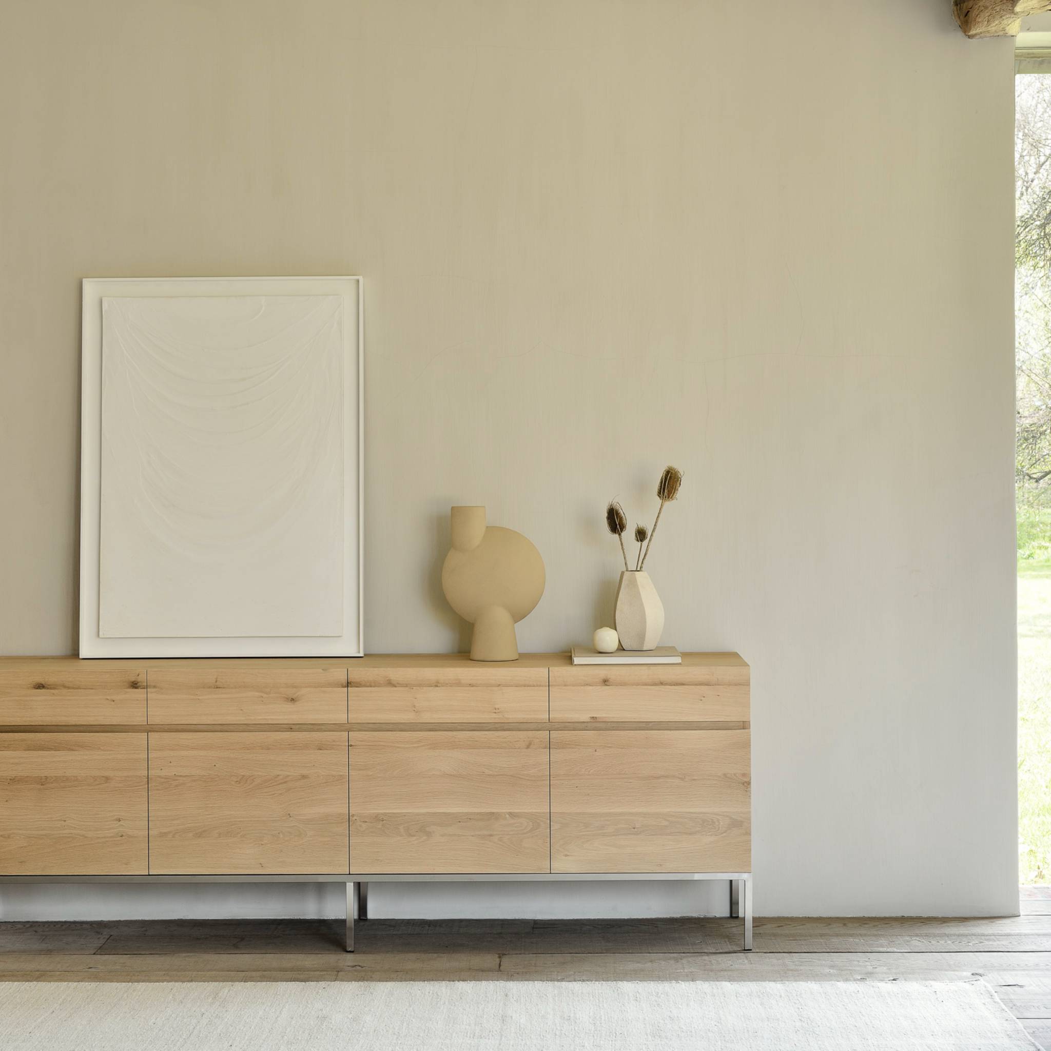 The Ligna Oak Sideboard from Sage Interiors offers a minimalist Scandinavian design, combining form and function. Crafted from solid oak with a hardwax oil finish, it features clean lines and recessed handles. Supported by black metal legs, this sideboard includes spacious drawers and cabinets, providing ample storage while maintaining a sleek, handle-free aesthetic. Its timeless design makes it a versatile addition to any modern interior.