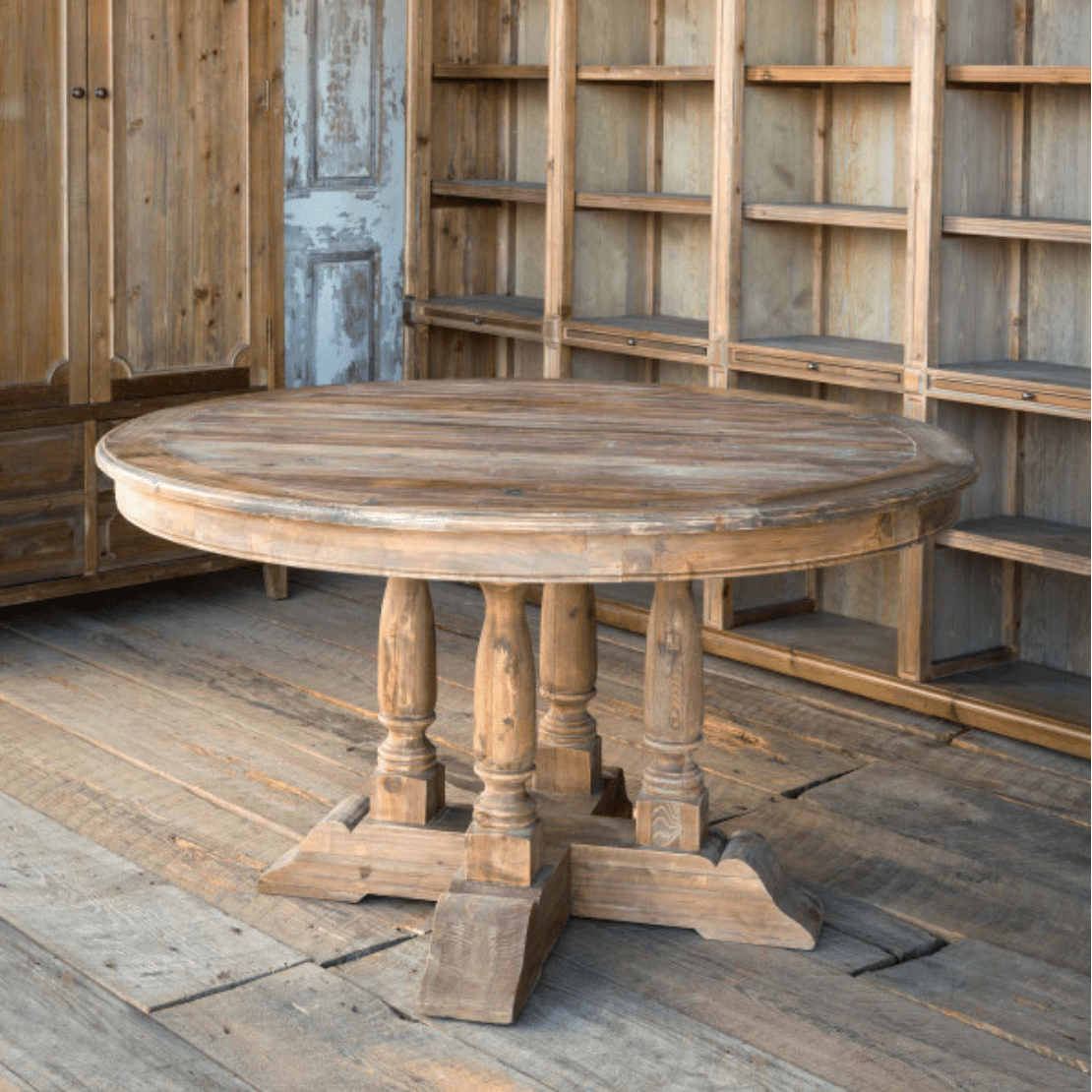 Rustic yet refined, four wooden columns form the distinctive table base of this aged pine balustrade table.