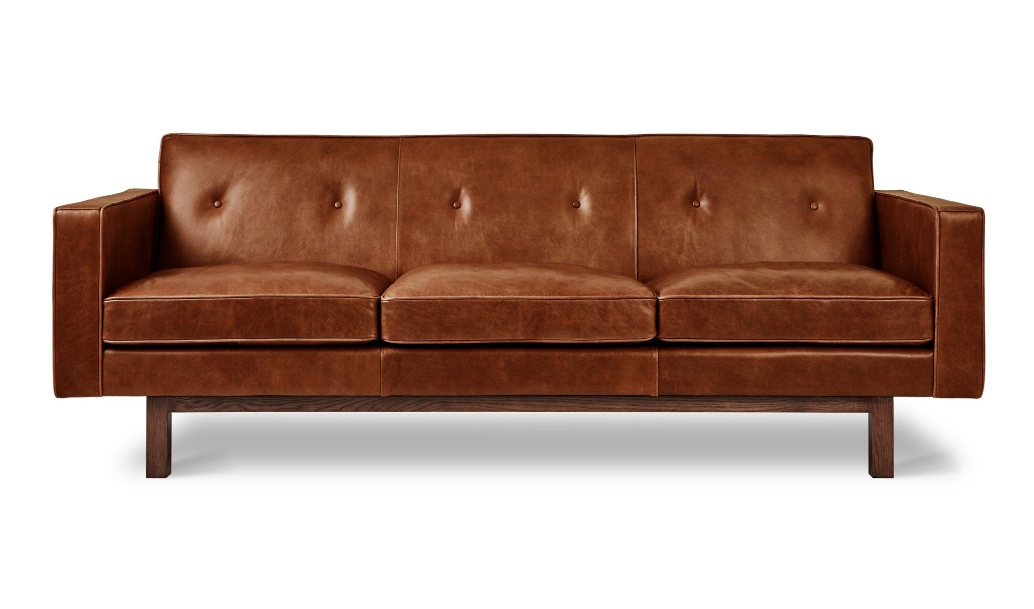 The Embassy Sofa blends timeless mid-century aesthetics with luxurious comfort, featuring a button-tufted tight back and tailored proportions for a refined presence. Upholstered in premium top-grain, aniline-dyed leather, each sofa is unique, with natural grain variations and markings that develop a rich patina over time. Piping accents and a recessed solid wood base provide visual structure, while seat cushions offer plush relaxation with medium-density foam wrapped in synthetic down. Designed to age gracefully and built to last, the Embassy Sofa is the perfect fusion of vintage charm and contemporary craftsmanship—ideal for modern living spaces. Matches seamlessly with the Embassy Chair.