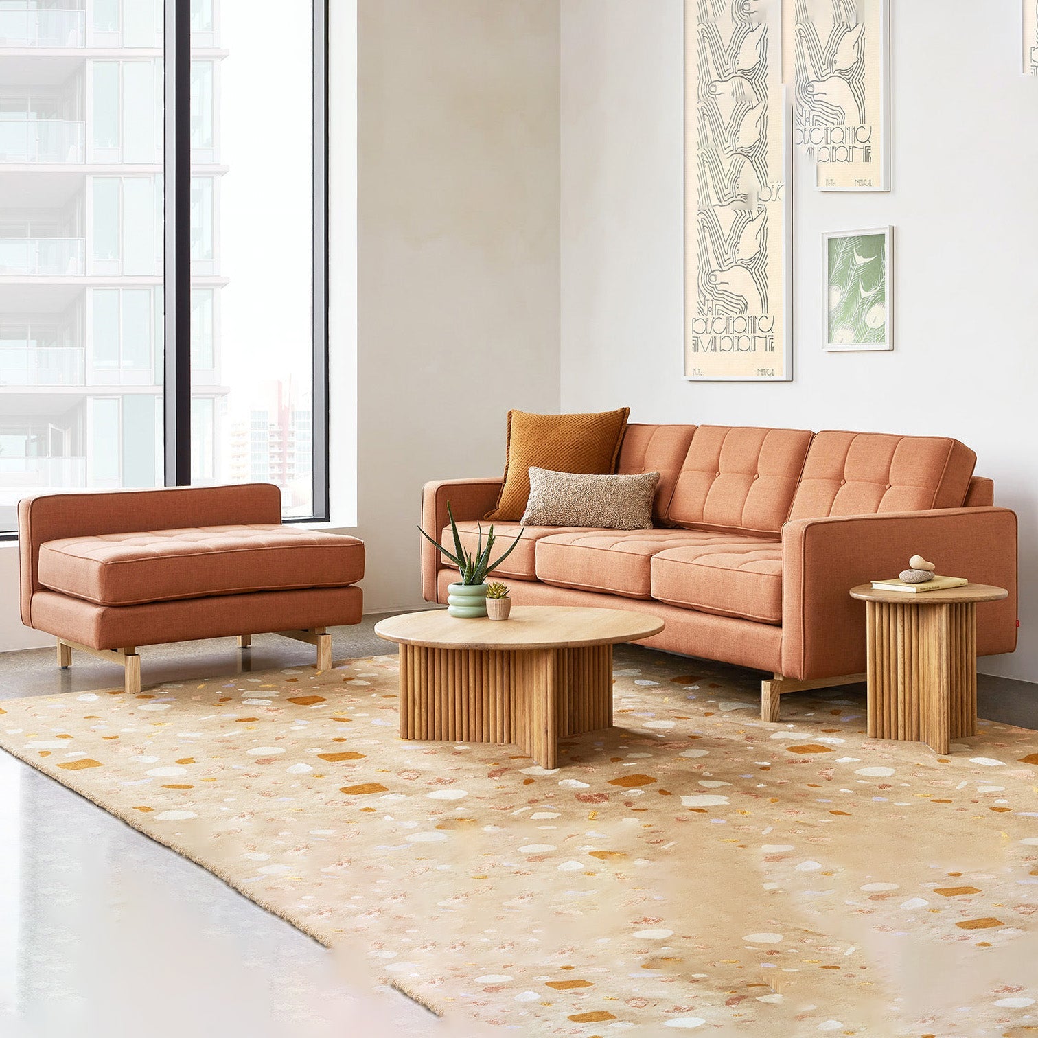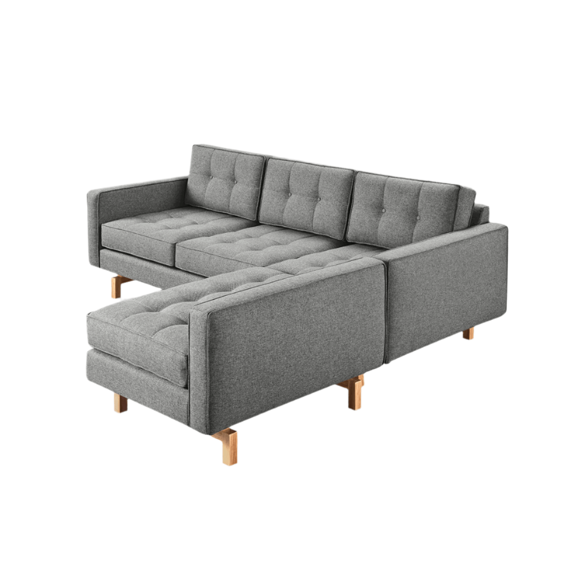 The Jane 2 Loft Bi-Sectional by Gus* Modern offers a refined take on mid-century style, combining versatility and modern proportions for compact living spaces. This small-scaled sectional features a reversible chaise design that easily adapts to your room layout. The piped upholstery edges, button-tufted cushions, and inset solid Ash wood base (available in walnut or natural finishes) lend sophistication and lightness to your interior. Thoughtfully engineered with a kiln-dried FSC®-Certified hardwood frame, sinuous spring suspension, and high-resilience foam cushions, the Jane 2 Loft Bi-Sectional blends eco-conscious construction with timeless comfort. Whether styled as a sectional or separated into a sofa and lounge, this piece is an adaptable icon for modern interiors.