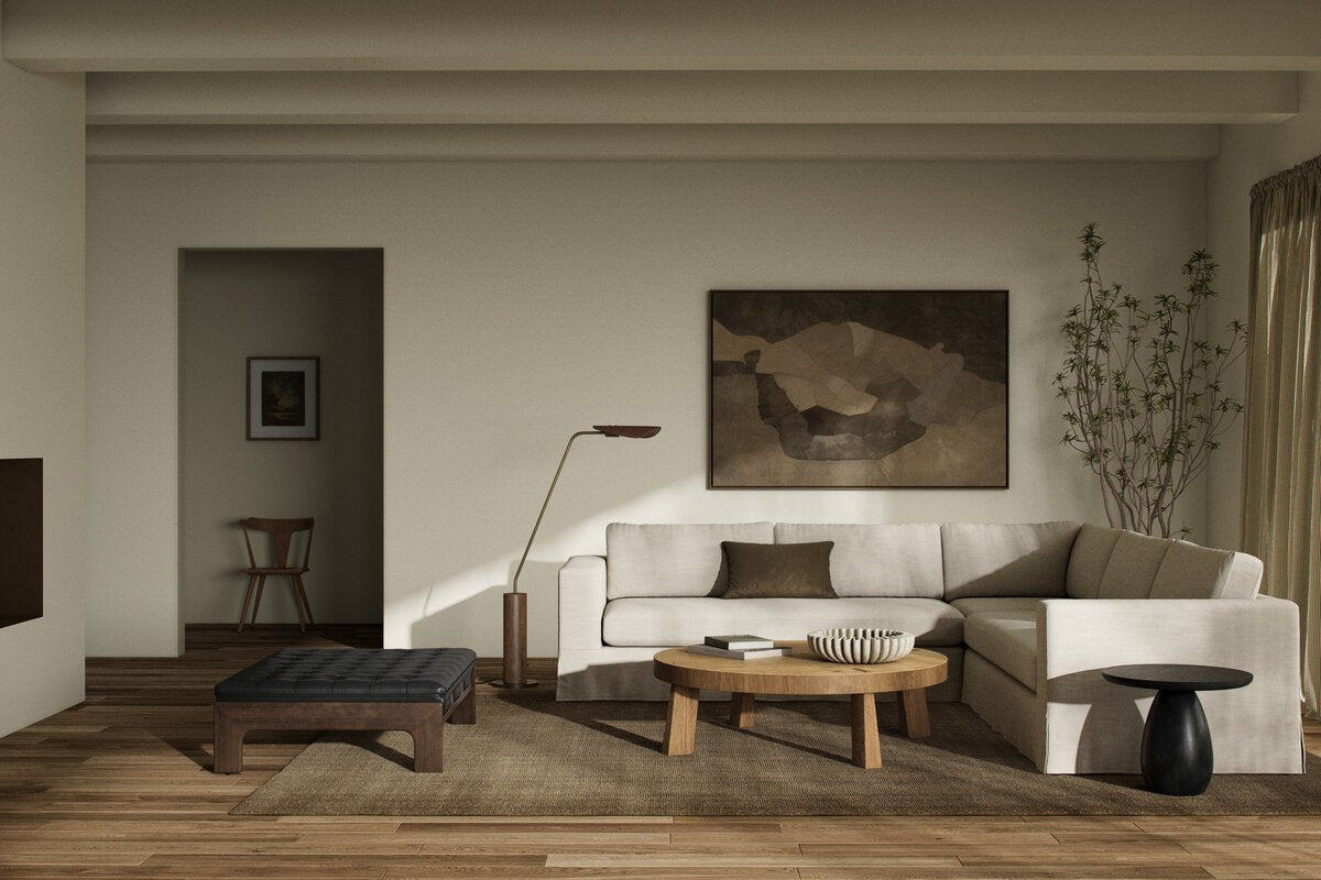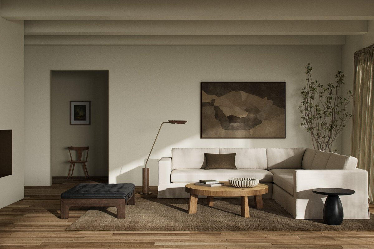 This relaxed three-piece sectional brings a clean, laid-back look to the living room. Deep pleats and a draped silhouette highlight the wide arms and oversized bench cushion, offering inviting comfort with a modern aesthetic. Due to the customized nature of made-to-order pieces, no cancellations or returns are accepted.
